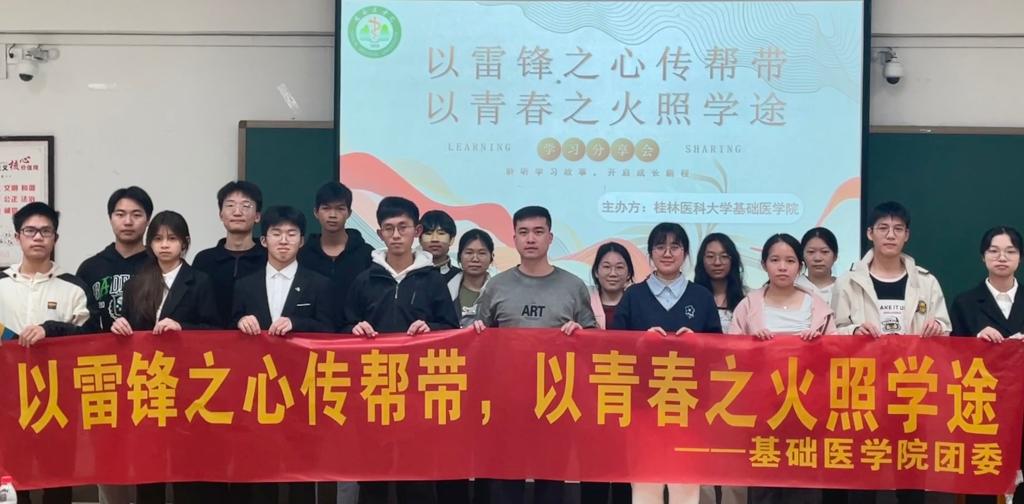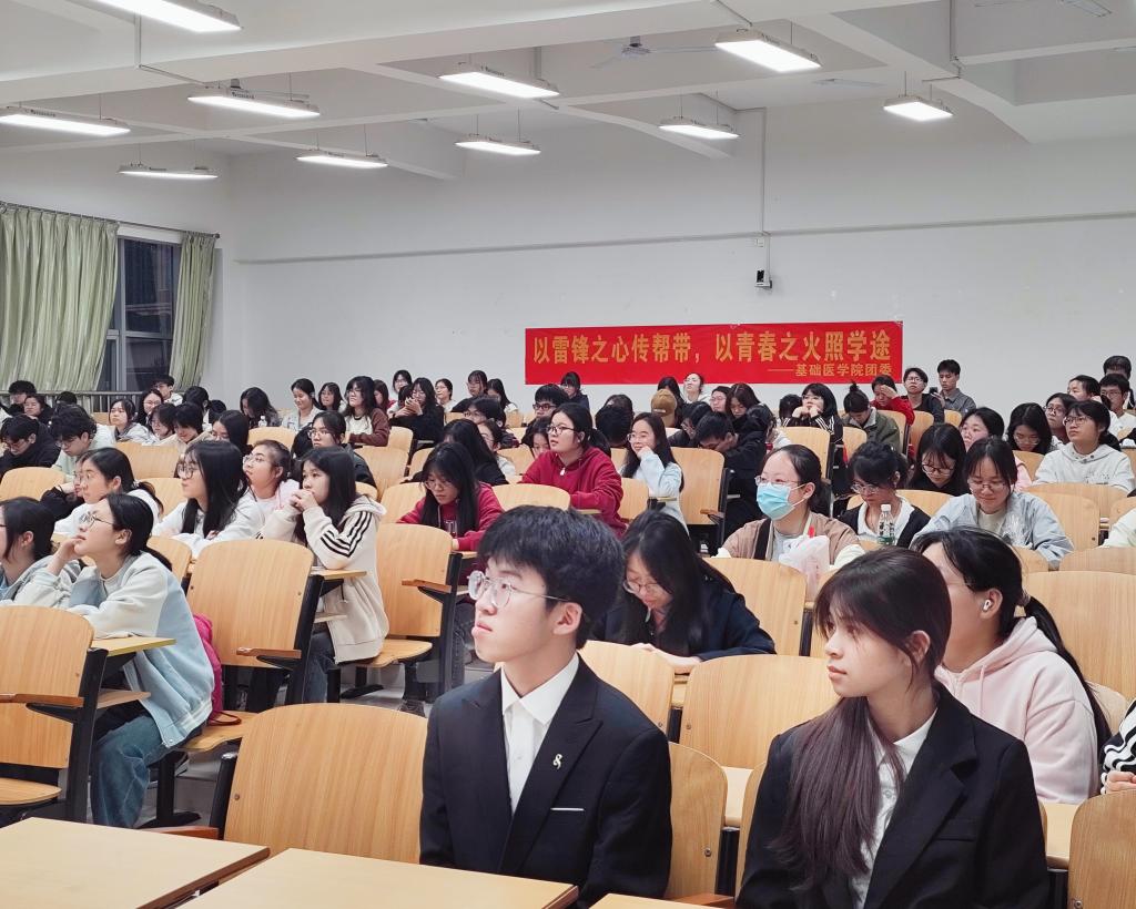 为深入学习贯彻落实习近平总书记关于弘扬雷锋精神的重要论述,促进广大青年学生之间互帮互助,营造积极的学习氛围,促进学院优良学风建设,基础医学院于2025年3月21日晚举办了主题为“以雷锋之心传帮带,以青春之火照前途”的优秀学子学习经验分享会。2023级临床医学本科姚雅馨、郑悦、李虹毅3名同学进行学习经验分享,学院师生代表200余人参加此次活动。