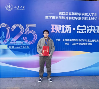 2025年12月20日,在济南举办的“第四届高等医学院校大学生数字形态学读片和数字解剖标本辨识技能大赛”全国总决赛中,我校2022级临床医学专业的张焕杨同学凭借出色的表现,荣获解剖学组特等奖-银奖。