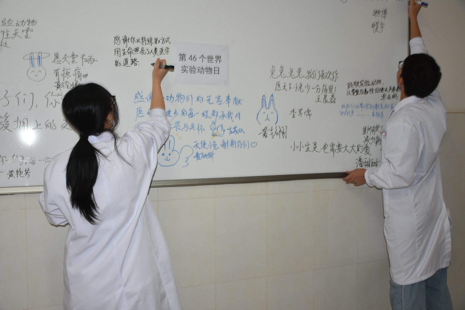 在“我与实验动物的故事”诗歌/漫画作品展示环节,作者以细腻的笔触、诗意的描写、拟人的手法,生动地描绘了动物实验“3R原则”(替代、减少、优化),动物福利和科学研究伦理要求和原则,展现了实验动物在现代科学领域中的重要价值。随后,在“写给实验动物的科学礼赞”环节、同学们纷纷在签字板上留言,致谢这些珍贵的生命,感谢它们用无声的语言教会了他们爱与被爱的真谛。最后,师生们向刚进行完实验为人类健康事业奉献了生命的实验动物默哀、献花,表达深深敬意。