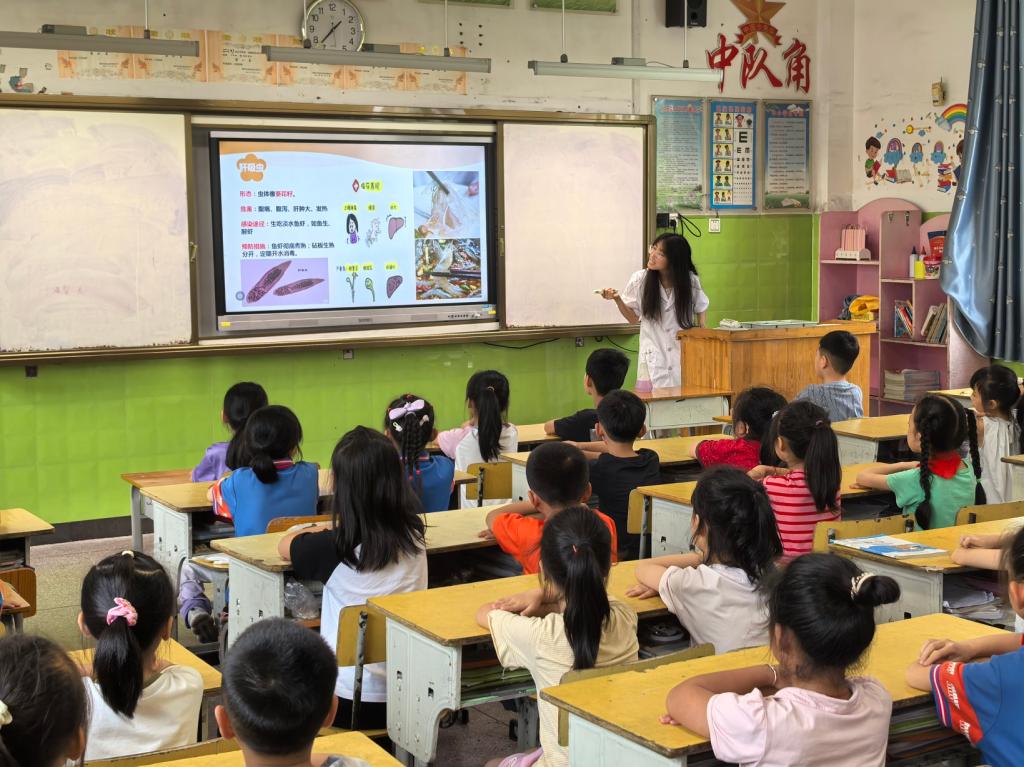 近日,为响应健康中国战略,提升青少年寄生虫病防控意识,在桂林医科大学基础医学院党委带领下,寄生虫学教研室组织2023级医学检验技术专业本科生走进桂林市临桂区致远小学、冠信远辰实验小学,开展“食源性寄生虫病防治”主题科普宣教活动,以专业知识助力健康校园建设。