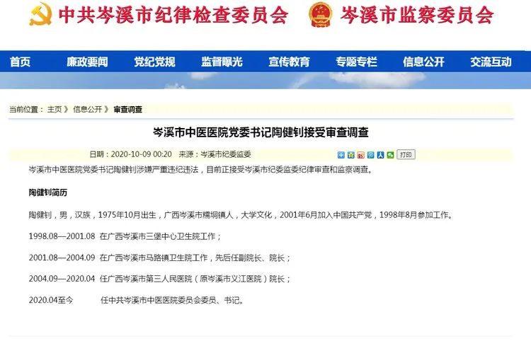 10月9日,据岑溪市纪委监委消息:岑溪市中医医院党委书记陶健钊涉嫌严重违纪违法,目前正接受岑溪市纪委监委纪律审查和监察调查。
