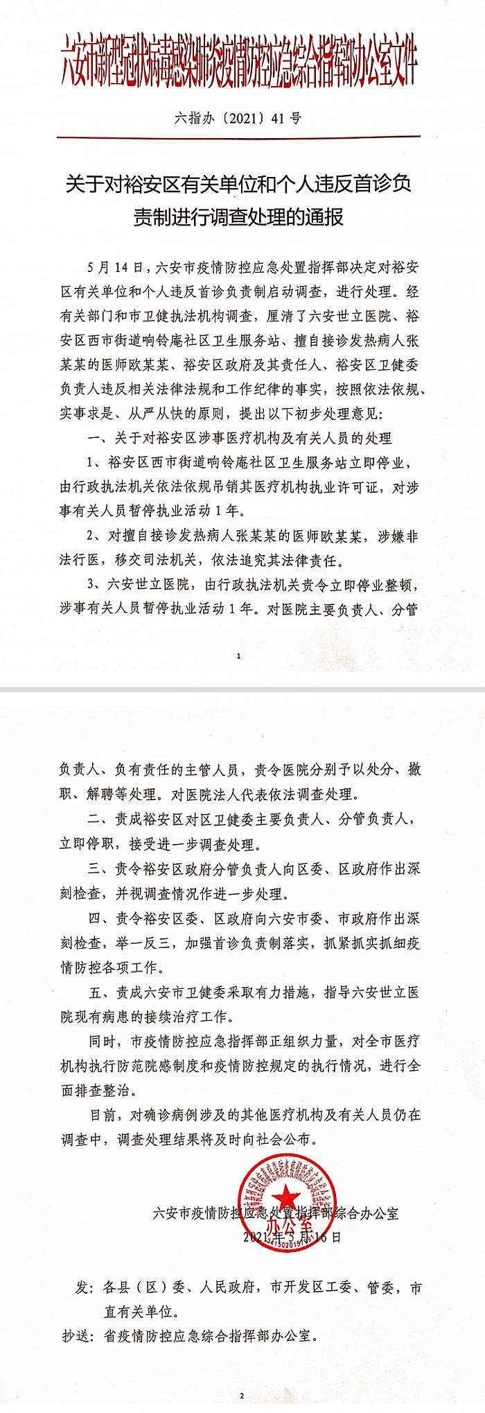 六安市卫健委网站发布《关于对裕安区有关单位和个人违反首诊负责制进行调查处理的通报》:5月14日,六安市疫情防控应急处置指挥部决定对裕安区有关单位和个人违反首诊负责制启动调查,进行处理。经有关部门和市卫健执法机构调查,厘清了六安世立医院、裕安区西市街道响铃庵社区卫生服务站、擅自接诊发热病人张某某的医师欧某某、裕安区政府及其责任人、裕安区卫健委负责人违反相关法律法规和工作纪律的事实,按照依法依规、实事求是、从严从快的原则,提出以下初步处理意见: