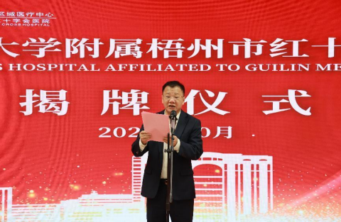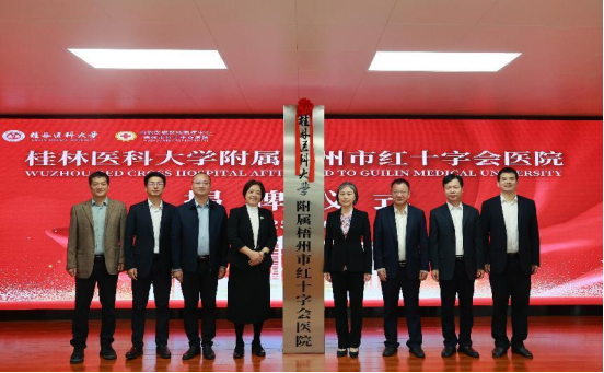 10月31日上午,桂林医科大学附属梧州市红十字会医院揭牌仪式顺利举行。桂林医科大学校长曾小云、梧州市副市长苏颖、市卫生健康委党组书记、主任宁金沛,以及学校相关部门负责人、附属梧州市红十字会医院党政班子成员、全体中层干部、校友代表和实习生代表共同出席仪式。