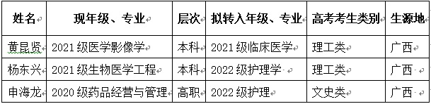 《中华人民共和国退役军人保障法》第三十五条规定,现役军人入伍前已被普通高等学校录取或者是正在普通高等学校就学的学生,服现役期间保留入学资格或者学籍,退役后两年内允许入学或者复学,可以按照国家有关规定转入本校其他专业学习。根据《桂林医学院本科学生转专业实施办法(修订)》(桂医教〔2020〕10号)、《桂林医学院高职学生转专业实施办法(修订)》(桂医教〔2020〕9号)和《桂林医学院大学生参军入伍优待政策(试行)》(桂医武装〔2020〕3号)文件精神,经学生本人申请,二级学院审核,教务处复核,同意向校长办公会提交并审定黄昆贤等3名参军退役复学学生的转专业申请。自今日起至2022年10月28日,在校园网公示五个工作日,公示期内如有异议,请署上真实姓名向学校教务处反映,电话:0773-5895810。
