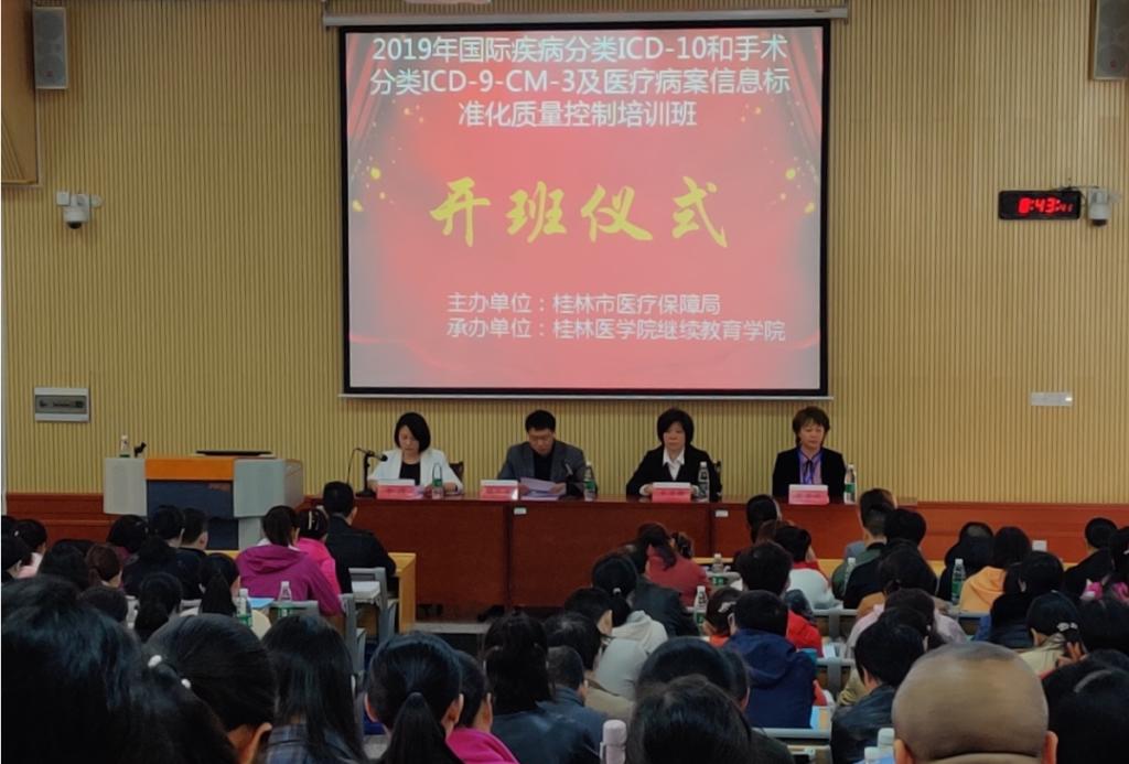 10月29日-11月5日,由桂林市医疗保障局主办、桂林医学院继续教育学院承办、华府教育协办的“2019年国际疾病分类 ICD-10 和手术分类 ICD-9-CM-3 及医疗病案信息标准化质量控制培训班”在桂林医学院东城校区顺利举办。桂林市医疗保障局副局长陆小春、医药管理科科长李莲、桂林医学院继续教育学院的领导老师和来自桂林市县两级医疗保障局、市社会保险事业局、市二级及以上定点医疗机构200名学员出席了开班典礼。