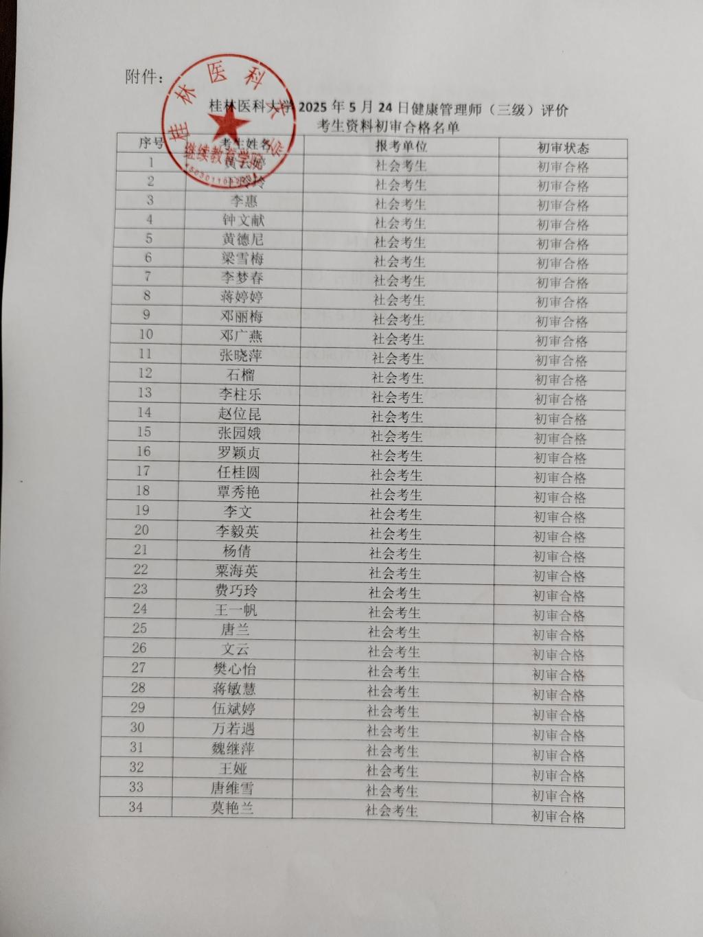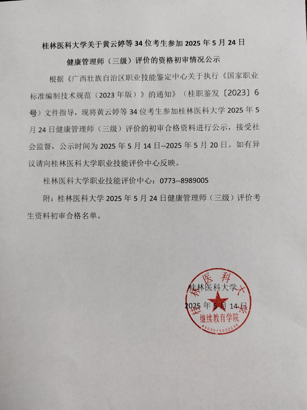 桂林医科大学关于黄云婷等34位考生参加2025年5月24日健康管理师(三级)评价的资格初审情况公示