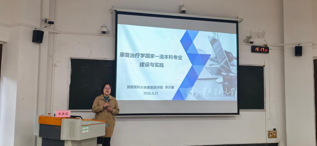 4 月 21 日下午,康复医学系特邀中国康复研究中心教育处处长乔柯姣、副研究员李洪霞开展交流授课活动,旨在提升学科建设水平,搭建与国内顶尖康复医院的合作桥梁。康复医学系主任王新涛、副主任王群、系部及第一附属医院康复医学科教师、2023级康复治疗学本科班学生到场聆听报告。