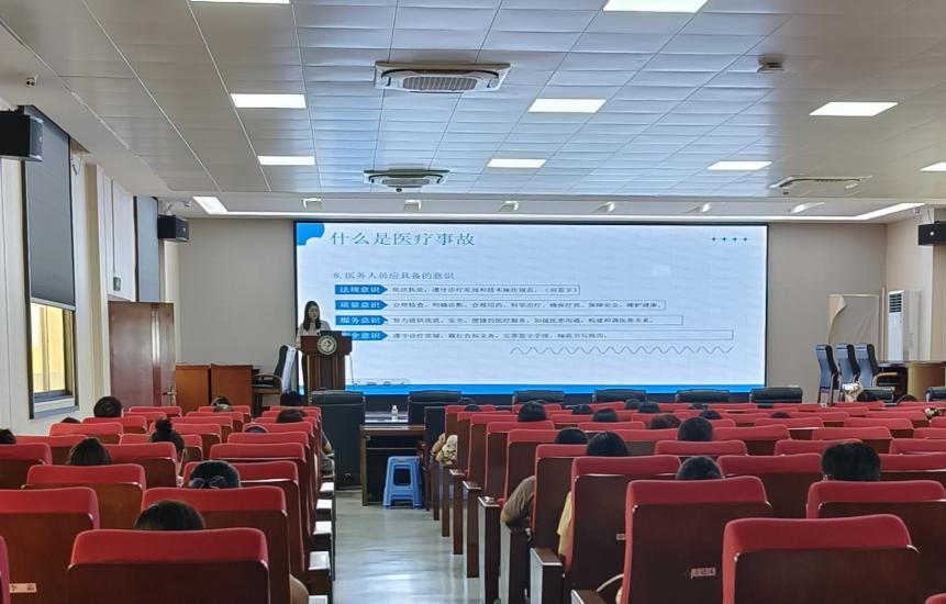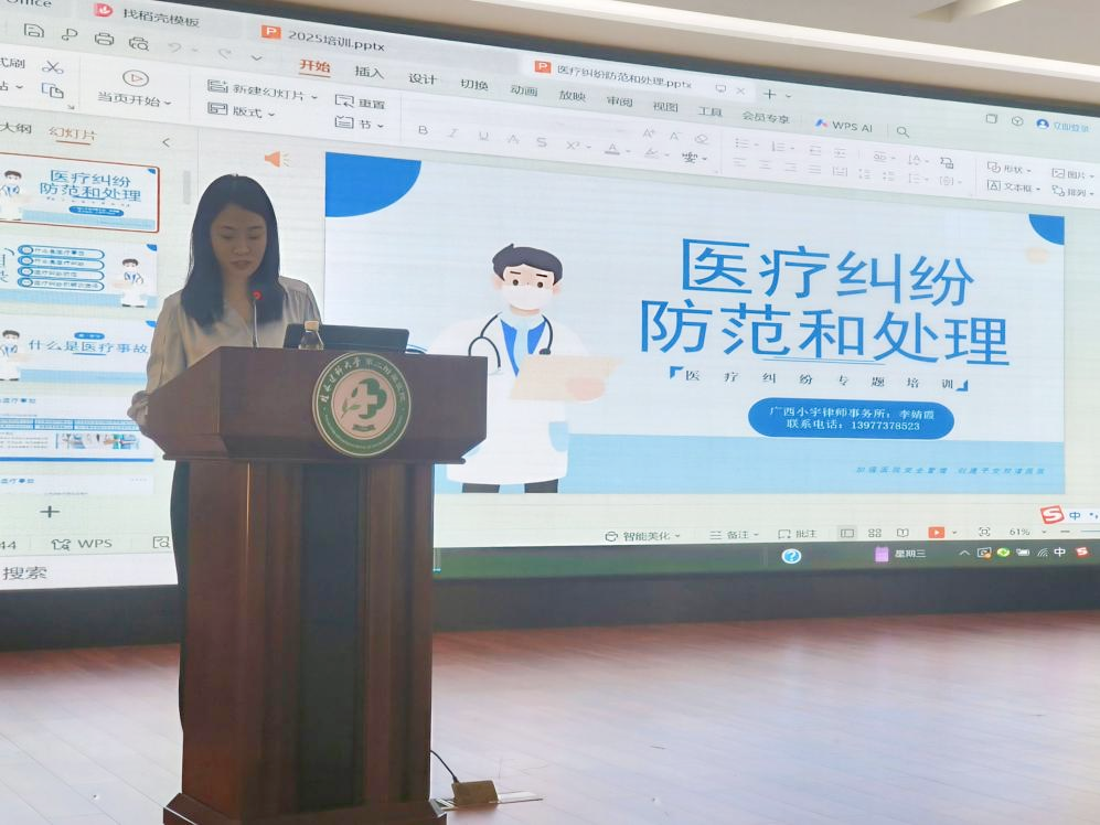 近日,为进一步增强全院职工法治意识,提升职工干部法治素养,强化医疗安全意识,构建和谐医患关系,桂林医科大学第二附属医院特邀法律顾问单位(广西小宇律师事务所)李婧霞律师到场开展医疗纠纷及法律知识培训,医院法治管理科(医患办)负责人严永超主持会议,全院各科室主任、护士长、及行政管理人员共近百名医务人员参加本次培训会。