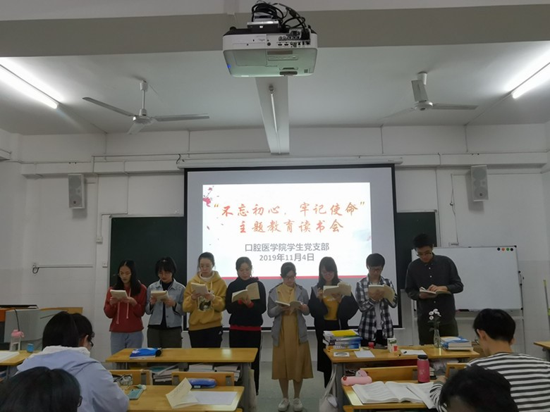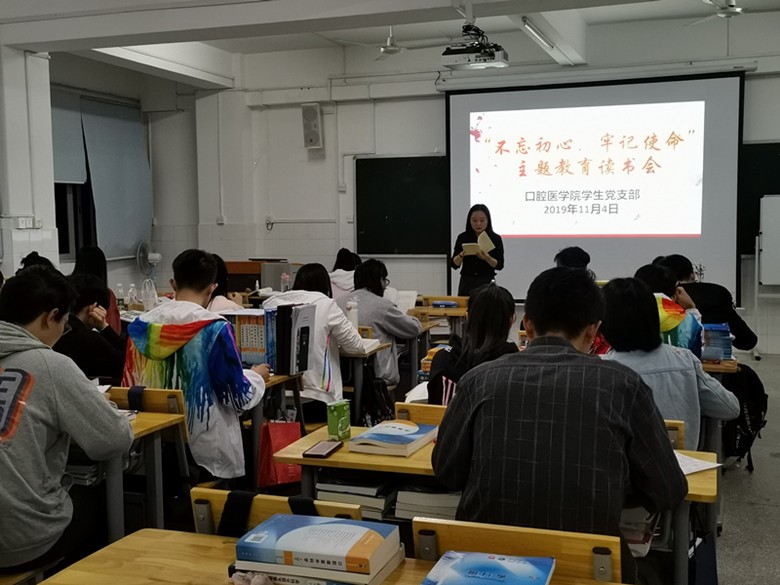 为开展好“不忘初心、牢记使命”主题教育,进一步提高全体党员“四个意识”、坚定“四个自信”、自觉做到“两个维护”。11月4日,口腔医学院学生党支部开展“不忘初心、牢记使命”主题教育读书会,由口腔医学院党总支副书记李媛领学,支部全体党员参与学习。