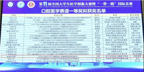 近日,第11届全国大学生医学创新大赛暨"一带一路"国际竞赛圆满落下帷幕。口腔医学院2021级和2022级本科生张鹭、陈宇钊、陈睿业、刘懿卿和莫明标组成的学生团队,在邱峰、蒋骞两位老师的指导下,凭借作品《RHEBL1通过p53信号通路影响口腔鳞癌增殖的机制研究》在口腔医学赛道中荣获复赛一等奖。