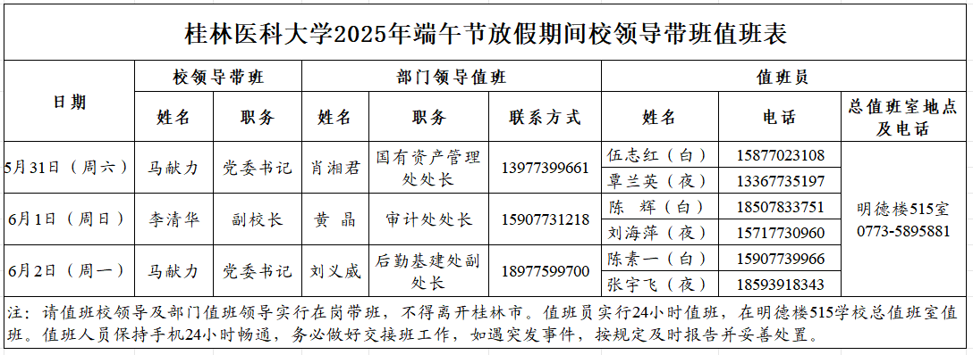 附件:桂林医科大学2025年端午节放假期间校领导带班值班表