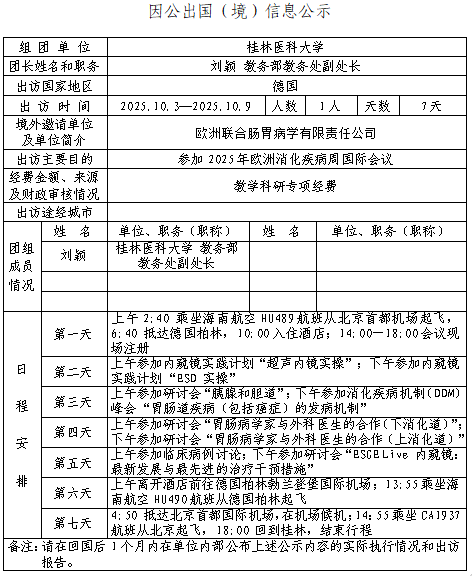根据中央因公临时出国(境)的有关文件规定和自治区因公临时出国(境)管理工作的要求,现将出访人员身份信息、公务安排、经费预算和来源、行程安排、境外邀请单位等信息在https://www.glmu.edu.cn/进行公示,公示期从2025年8月5日至2025年8月11日止,共5个工作日。如对公示内容有异议,可以电话或书面形式进行反馈。
