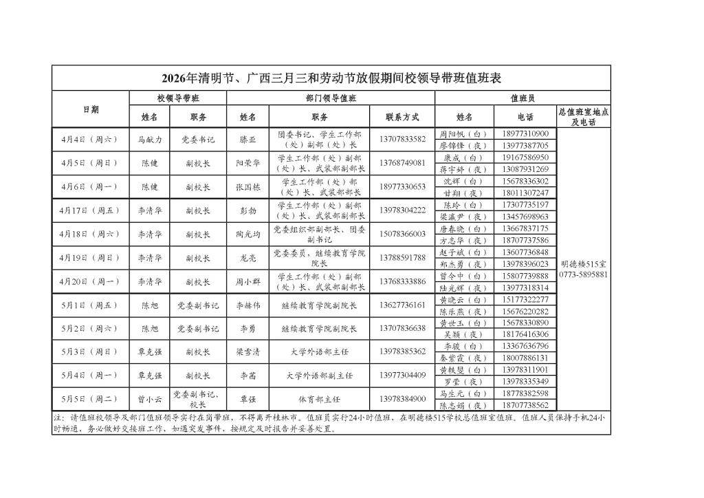 根据国务院和自治区政府办公厅有关通知要求,为确保节日期间学校安全稳定,及时处置各类突发事件,结合学校实际,现将我校2026年清明节、广西三月三、劳动节放假有关事项通知如下: