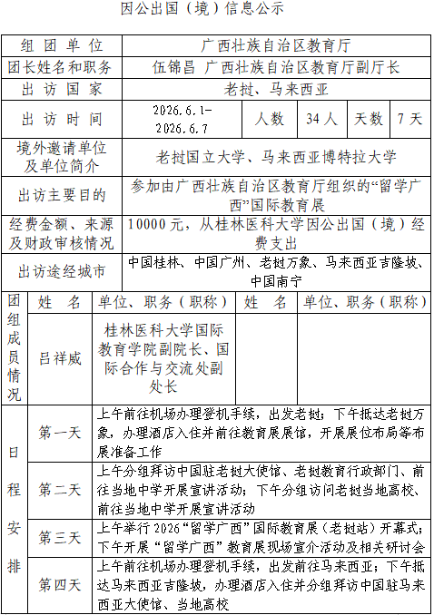 应老挝国立大学、马来西亚博特拉大学的邀请,为加强“留学广西 智创未来”品牌建设,吸引更多优秀留学生来我校学习,经学校研究决定,拟派吕祥威同志于2026年6月1日至6月7日访问老挝、马来西亚,参加由广西壮族自治区教育厅组织的“留学广西”国际教育展。