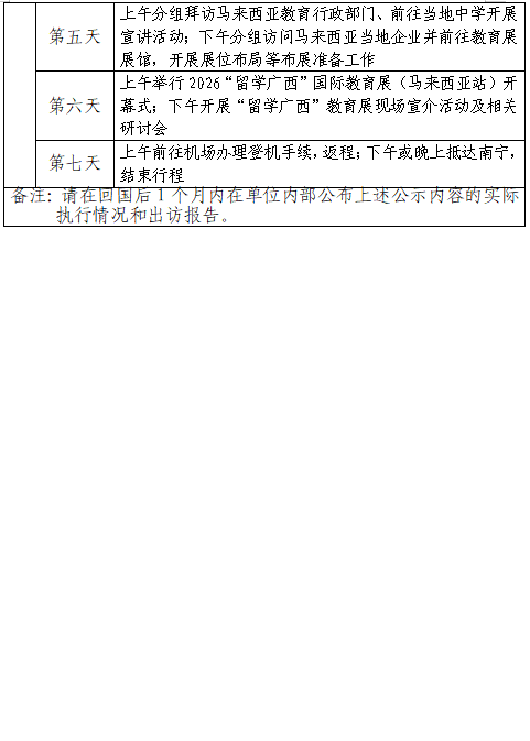 根据中央因公临时出国(境)的有关文件规定和自治区因公临时出国(境)管理工作的要求,现将出访人员身份信息、公务安排、经费预算和来源、行程安排、境外邀请单位等信息在单位内部进行公示,公示期从2026年4月24日至2026年4月30日止,共5个工作日。如对公示内容有异议,可以电话或书面形式进行反馈。