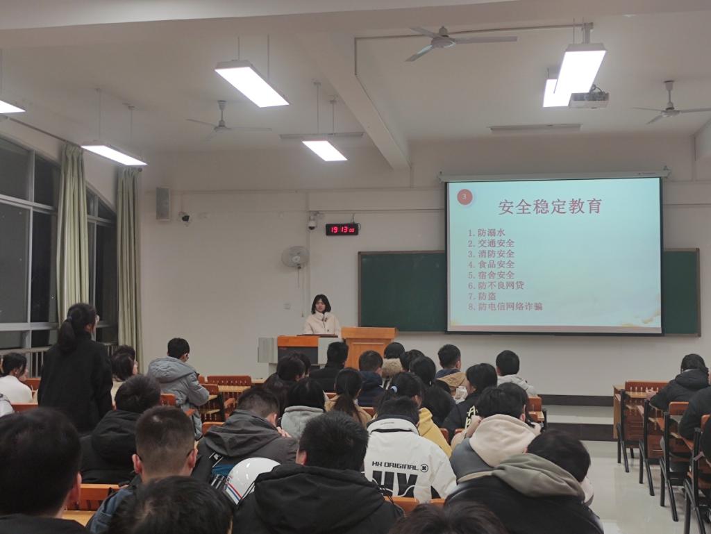 主题班会围绕“3年抗疫的巨大成就”“党的二十大精神”“安全稳定教育”“后疫情时代心理健康教育”四个方面展开本次班会的内容。各辅导员指出当前新冠疫情趋于稳定,总结出我国在抗疫三年来取得了巨大的成就,这也是全国人民共同努力取得的。接着讲述了党的二十大精神,并强调“爱国、团结、奋斗、科学、互助”是新时代好青年的优良品质。在安全教育上,围绕防溺水、交通安全、食品安全、消防安全、电信诈骗等安全隐患方面展开具体的防范方法,并指出同学们要增强安全防范意识,防患于未然。最后,各辅导员总结了上一学期班级成绩并部署下一学期的计划。