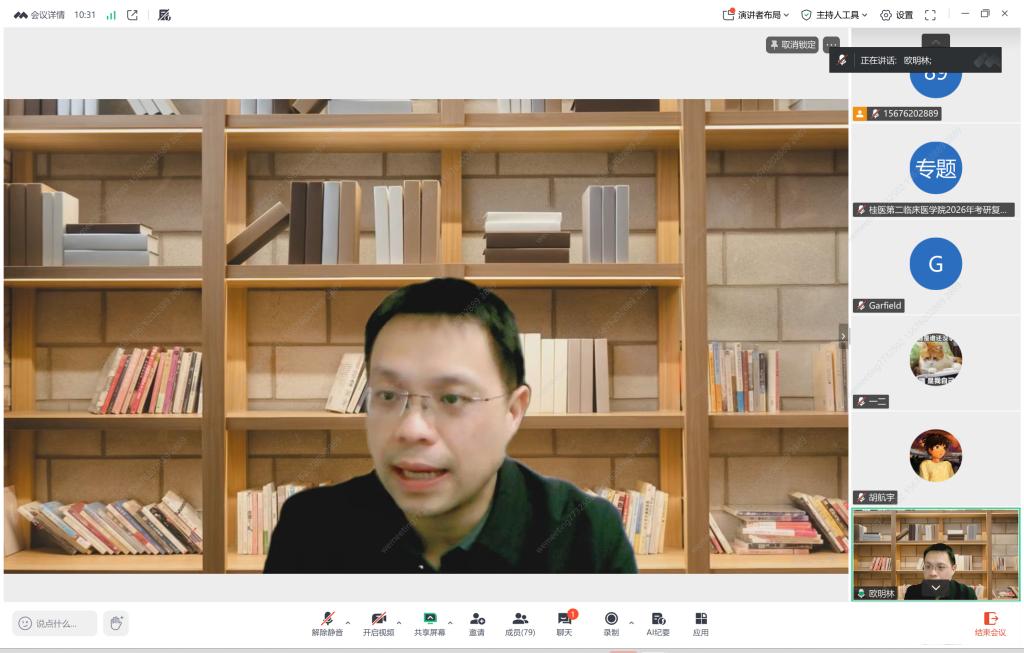 此次系列培训精准对接学子复试刚需,按节奏有序推进、层层递进。3月1日,考研复试经验交流会率先开展,三位在读研究生结合自身实战经历,从备考规划、专业梳理、临场应变、英语口语等方面分享心得,现场互动热烈,有效缓解了学子备考焦虑;3月12日,学院邀请第二附属医院中心实验室主任欧明林教授开展专题讲座,以“集中授课+互动答疑”形式,结合医学专业复试特点,系统讲解复试流程、礼仪细节及答题逻辑,提供针对性指导;3月15日,线上线下结合的考研模拟复试同步开启,多名临床各学科教授担任考官,全程复刻真实复试场景,赛后一对一精准点评,帮助学子找准短板;3月16日,研究生院招生办公室唐劲礼老师开展线上培训,详细解读2026年硕士研究生招录政策及调剂规则,为学子提供权威政策指引。