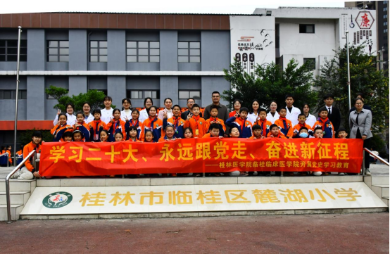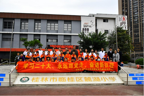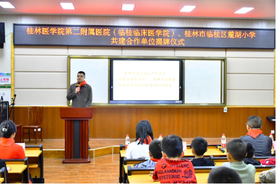 少先队员们为与会嘉宾佩戴红领巾,欢迎他们的到来。黄宇平致开幕词。他提出,与麓湖小学共建合作,不仅可以融合多种表现形式、传播手段,促进健康知识科普工作多层次发展,提升健康科普服务的公平性、可及性、有效性,更重要的是将党的二十大精神落实到日常服务工作中,贯彻执行党的路线、方针、政策。随后,王立国发言。他表示,希望通过院校之间的合作,充分利用现有的医疗教育资源,开展丰富多彩的医学科普活动、健康知识宣传活动,引导孩子们主动去学习、探索知识,大胆实践,感受医学的奥妙。接下来,两所院校举行桂林医学院第二附属医院(临桂临床医学院)“三全育人”技能培训基地,以及临桂临床医学院菁华志愿服务团、菁华急救宣讲团医学知识教育基地的揭牌仪式。