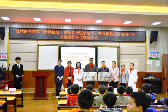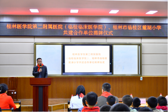 为了学习贯彻党的二十大精神,深入开展“三全育人”综合改革工作,增强新形势下健康科普工作能力,提高青少年儿童的健康素养和健康水平,2023年3月14日16︰00,桂林医学院第二附属医院(临桂临床医学院)、桂林市临桂区麓湖小学举办共建合作单位揭牌仪式。桂林医学院第二附属医院(临桂临床医学院)党委副书记黄宇平、桂林市临桂区麓湖小学校长王立国出席此次活动。