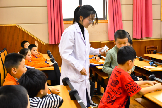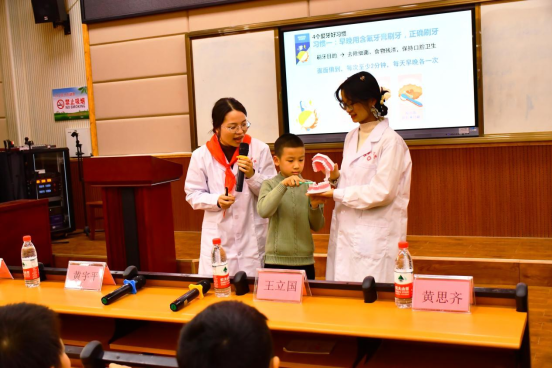 揭牌仪式结束后,我院口腔科医师汤罗艳和医学生志愿者分别在小学阶梯教室、班级教室给同学们授课。首先,师生志愿者开展以党的二十大精神“青年说”为主题的党的二十大报告领读活动,引导小学生学习党史知识,努力成长为德智体美劳全面发展的社会主义建设者和接班人。随后,师生志愿者借助生动有趣的口腔健康教学课件和视频,从认识牙齿的结构开始,逐步教授同学们如何正确刷牙、使用牙线等爱护牙齿、预防龋齿的生活知识。在授课过程中,同学们认真听讲,在有奖问答和游戏互动环节中积极举手、踊跃回答问题,这不仅使现场的气氛融洽热烈,还增加了小学生对于口腔知识的了解,提高了小学生对口腔的保护意识。