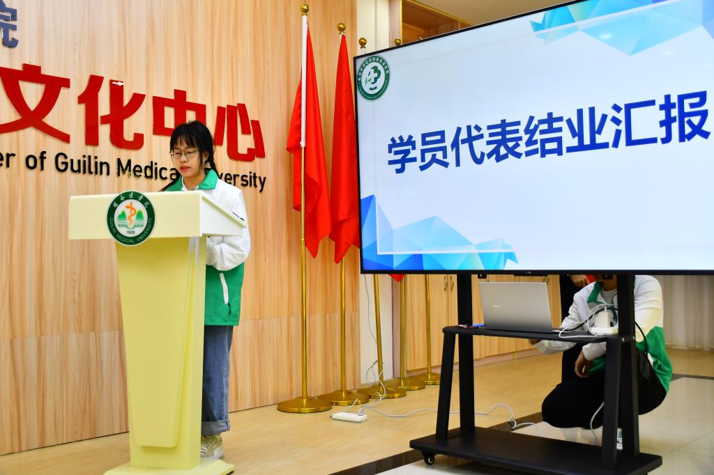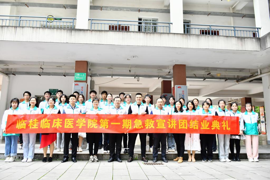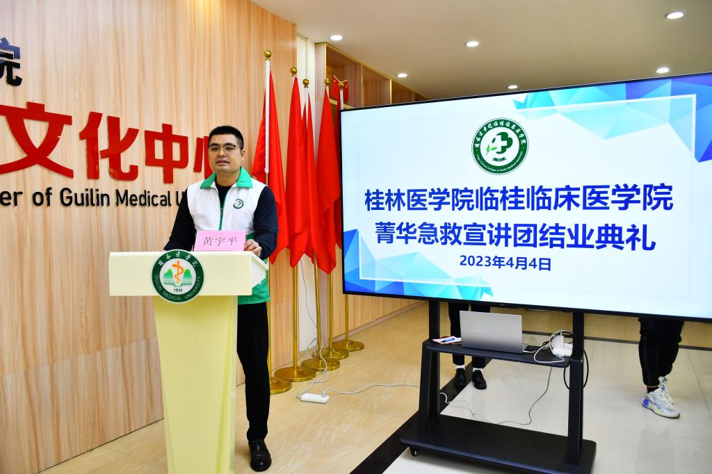 为学习贯彻党的二十大精神,全面贯彻落实中共中央、国务院颁布的《“健康中国2030”规划纲要》,弘扬“奉献、友爱、互助、进步”的志愿服务精神,2023年4月4日16︰00,临桂临床医学院在临桂校区新时代大学生党建文化中心举行第一期菁华急救知识宣讲团结业典礼。桂林医学院第二附属医院(临桂临床医学院)党委副书记黄宇平,学院学工办、团委、急诊科、教学管理部相关负责人出席本次活动,第一期菁华急救知识宣讲团学员参与本次活动。