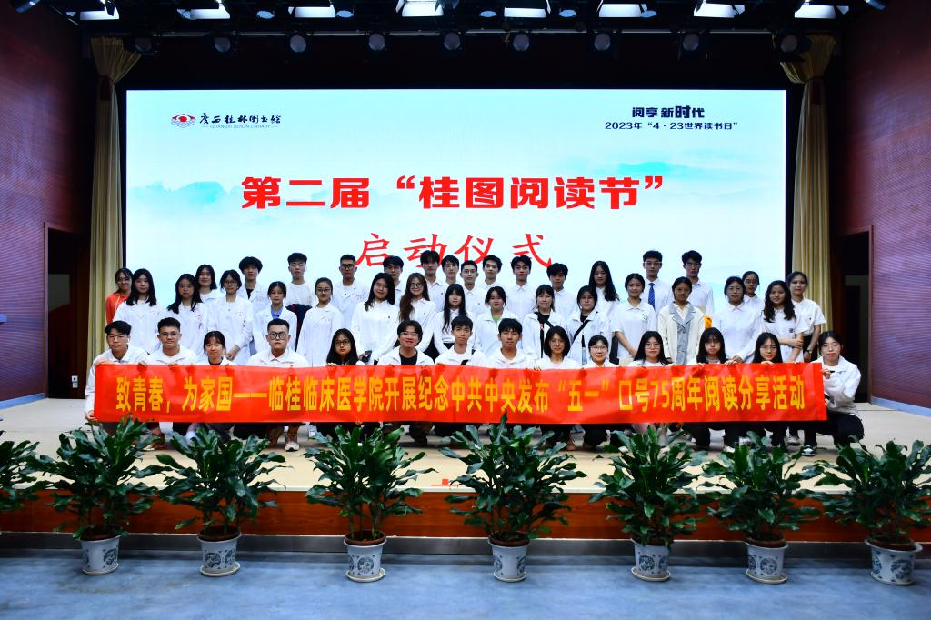 4月23日上午,在“桂图阅读节”启动仪式上,四个阅读小组分别朗诵《五四的旗帜》《祖国奏鸣曲》《如果要写一首诗》《该怎么书写我的祖国》等阅读选段,共同演绎青春热情与家国情怀,共话先辈们的青春魅力,精彩的演出赢得了现场观众的阵阵掌声。临桂临床医学院荣获“最佳组织奖”,50名同学被评为“优秀朗读者”。