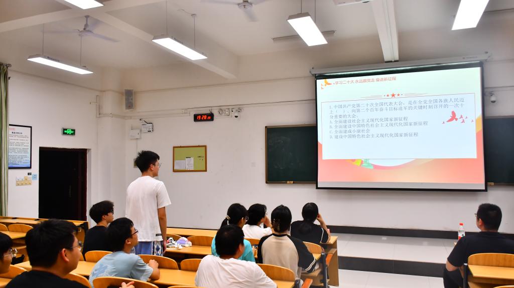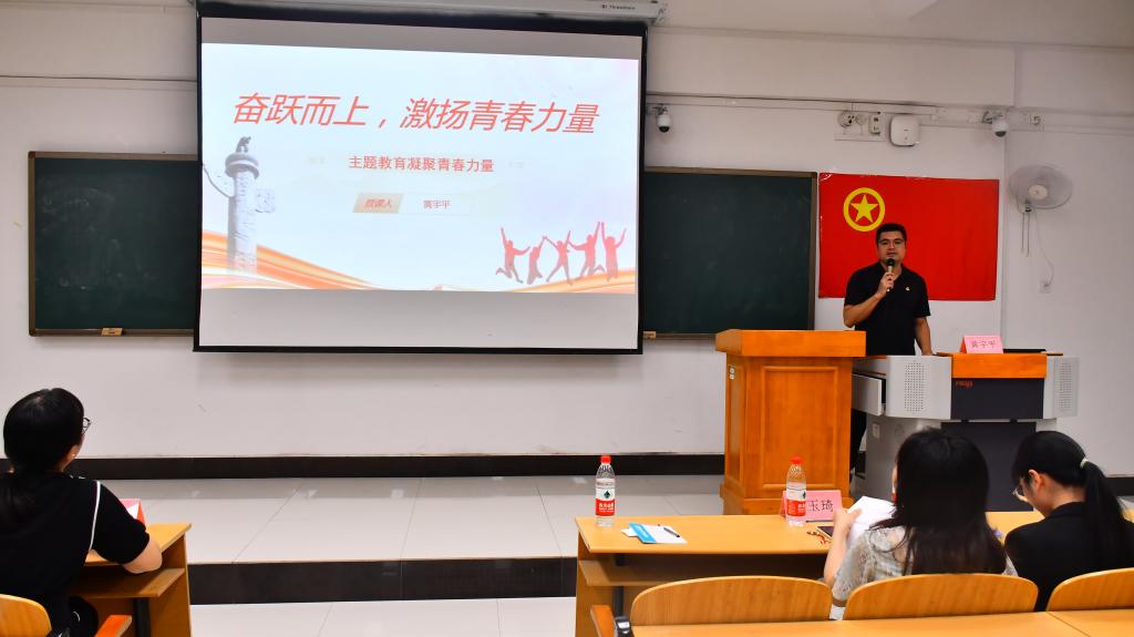宣讲活动包括四个部分。第一部分是《团的基础知识》主题团课。学工办老师王珂给同学们介绍了团旗、团徽、团歌、入团誓词、团员的权利和义务等团的基础知识,让同学们加深对基础团务的了解,切实提高同学们的思想觉悟和理论素养。第二部分是《在新时代新征程上书写青春篇章——学习中国共产主义青年团第十九次全国代表大会会议精神》主题团课。学工办主任蒋艳平介绍团的十九大会议精神,号召同学们坚持以习近平新时代中国特色社会主义思想为指导,踔厉奋发、勇毅前行,为强国建设、民族复兴伟业团结奋斗。第三部分是《奋跃而上,激扬青春力量——学习贯彻党的二十大精神》主题团课。党委副书记黄宇平围绕“青春”这一主题,给同学们分享了许多青春故事。他鼓励同学们珍惜青春、积极进取,以奋斗姿态激扬青春,不负时代,不负华年。第四部分是个人奋斗故事。2022年度“广西优秀共青团员”获得者冯荣华围绕“坚定理想,不忘初心”的主题,从思想、学习、科研及志愿服务等方面讲述自身成长故事,鼓励同学们勇于尝试新事物,争做时代新青年。为教育引导广大团员青年学党史、强信念、跟党走,团结引领广大团员青年在学思践悟中踔厉奋发、笃行不怠,此次宣讲会上还开展了两轮党史知识有奖竞答。同学们踊跃参与,积极答题,达成了以赛促学的目的。