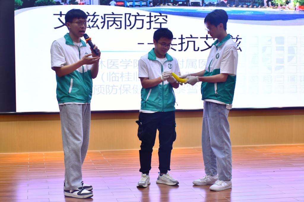 在桂林理工大学雁山校区图书馆报告厅,黎雪桂以“艾滋病防控”为主题进行知识宣讲。他结合真实案例,就艾滋病的流行概况、传播途径、预防与控制等三个方面进行详细讲解,教导同学如何预防和看待艾滋病及艾滋病患者,使同学们正视、关注、有效预防艾滋病,养成健康的生活方式。随后,医学生志愿者讲解、演示避孕套的正确佩戴、脱卸、处理避孕套的方法,并邀请在场大学生上台展示学习成果,提高同学们的防护意识。