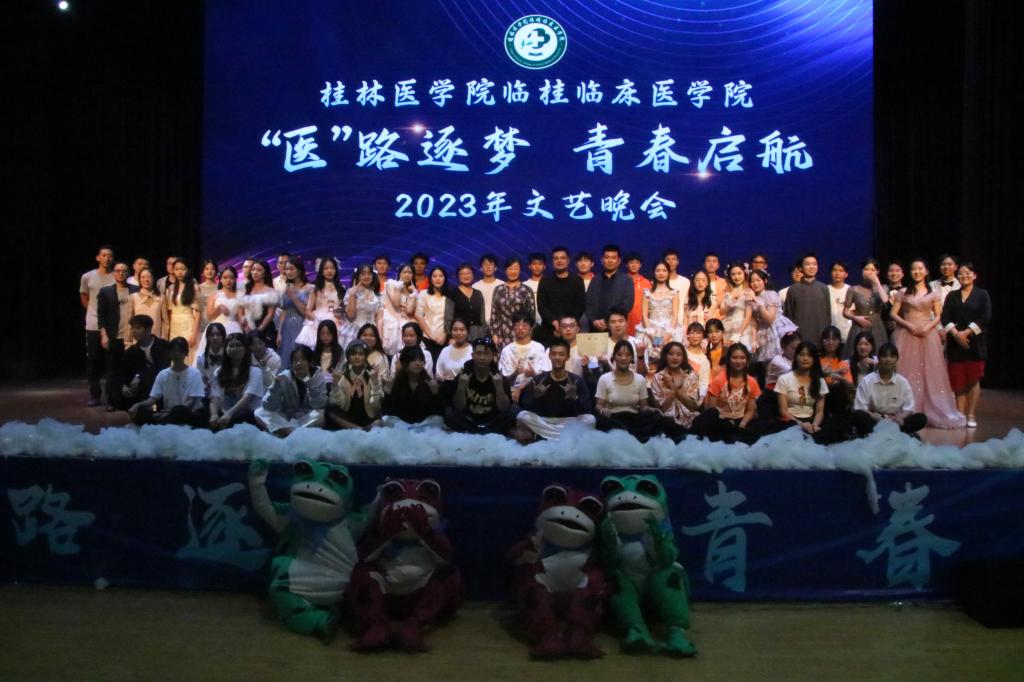 10月14日19:00,临桂临床医学院“‘医’路逐梦,青春启航——2023年文艺晚会”在大学生活动中心4楼演艺厅精彩上演。基础医学院党委书记朱开梅、第二附属医院(临桂临床医学院)党委副书记黄宇平,各二级学院团委老师,我院各班级大学生导师、班主任、学工办老师以及全体学生共同欣赏演出。