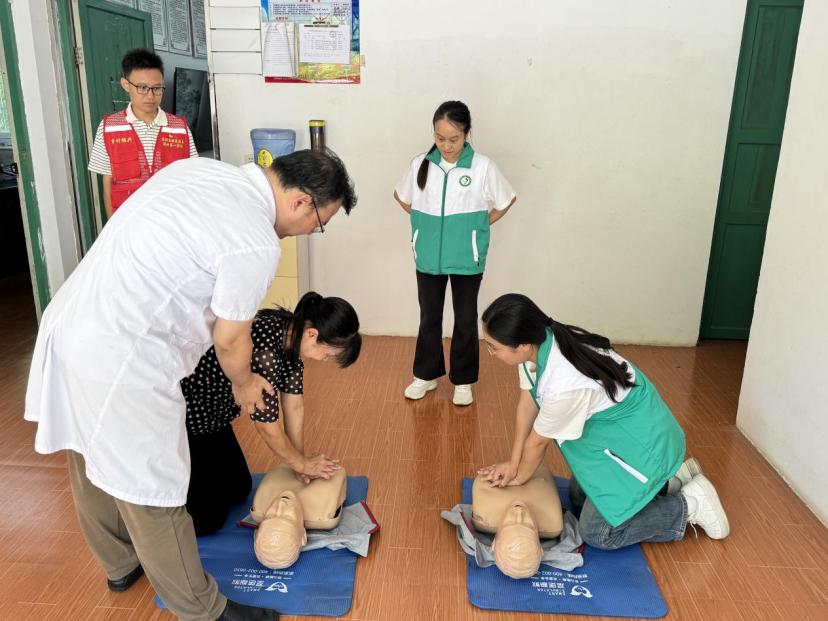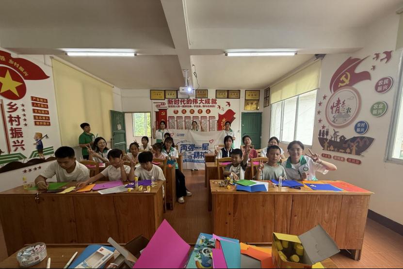 健康服务惠乡村。7月8日,师生志愿者来到龙胜各族自治县三门镇交其村,分为四个小组,有序地开展活动。在惠民义诊活动中,学生志愿者配合心血管内科、妇科、骨科、消化内科、中医科、眼科、胸心血管外科、疼痛科、药学部等多个科室的医护人员,开展登记诊疗信息、测量血压等工作,协助医护人员为群众进行相关学科疾病的诊查,根据不同年龄层的问诊状况提出切实可行的建议,并有针对性地免费发放相关药品,让群众在家门口就能享受优质便捷的诊疗服务。在健康宣教活动中,学生志愿者配合急诊医学科医生开展急救知识普及活动,系统讲解海姆立克急救法、心肺复苏术等急救技能,并重点普及防蛇咬伤知识,以及现场指导心肺复苏急救实操演练等方式,增强群众的应急救护意识。在“情暖夕阳”活动中,师生志愿者与老人围坐一堂,手把手教授毛线手工花制作技巧。在温馨的互动中,银发与青春交织,一根根彩线化作绽放的花朵,传递着跨越代际的温暖。活动尾声,志愿者们为每位老人送上纪念品,让这份美好记忆得以延续。同时,菁华志愿服务团作为2025年全国大学生“两弹一星”精神宣讲团入选团队,在“童心向党”活动中创新采用“宣讲+实践”模式。学生志愿者巧妙运用“恐怖箱”游戏,引导孩子们直面未知,打破对辐射的恐惧认知,认识到辐射在日常生活中的常态性。科普环节结束后,志愿者向孩子们发放材料,带领大家共同制作“两弹一星”主题贺卡,让“热爱祖国、无私奉献”的精神在指尖流淌,实现红色教育从理论认知到情感共鸣的升华。