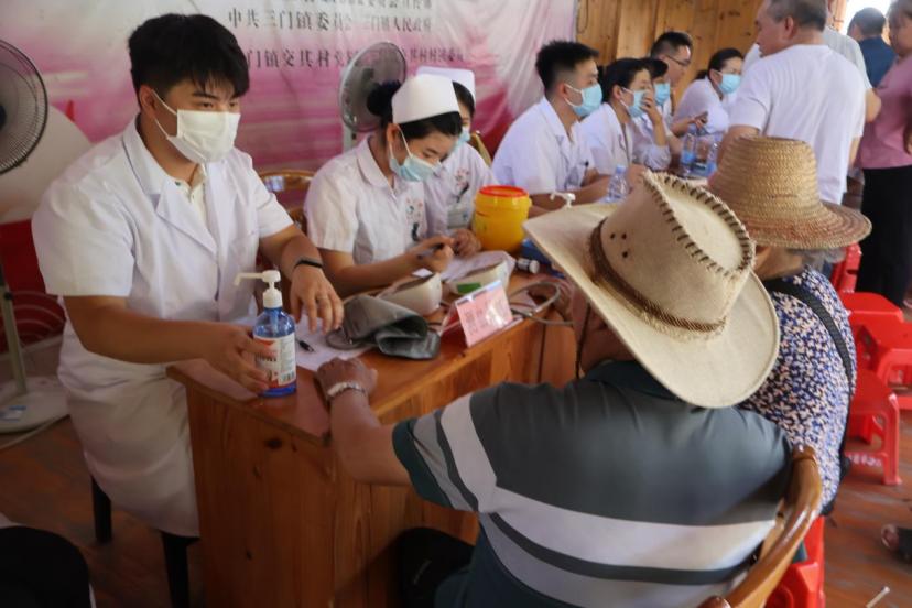 送医基层暖民心。7月2日,师生志愿者配合医护人员到六塘镇中心卫生院门诊部门前开展义诊活动。除了免费体检,如测血压、测血糖、心电图检查、超声检查等基础健康检查外,还有神经外科、呼吸与危重症医学科、内分泌科、泌尿外科、消化内科、全科医疗科、胸心血管外科、心血管内科、耳鼻咽喉头颈外科、眼科、疼痛科、康复医学科等多个科室的专家现场坐诊,为居民提供一对一的健康咨询与诊疗建议。学生志愿者为村民科普健康素养知识,并引导群众进行健康咨询和相关检查。此外,义诊现场发放针对高血压、糖尿病等常见慢性病的常用药品,以及赠送免费检查、治疗体验券、小礼品。