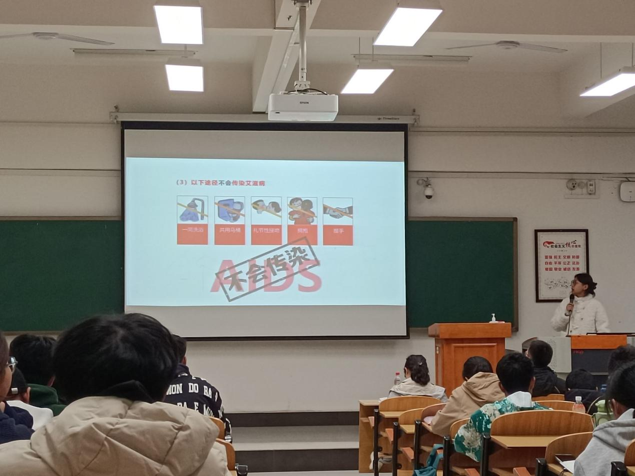 活动开始,主持人首先从艾滋病的历史、目前患病人数、定义进行宣讲,从艾滋病的三大传播途径之性传播、血液传播、母婴传播和艾滋病的三大危害之对个人、家庭、国家的危害进行了详细讲解,并总结了艾滋病预防措施,号召在校大学生从自我做起,洁身自爱、远离毒品、不轻易接受输血和血制品等。接着,班主任黄毅老师从另一个视角向同学们科普艾滋病的知识,结合临床病症给同学们分析HIV感染和艾滋病是两种不同的情况。会场的每一位同学都认真听黄毅老师和主持人的科普宣传,同学们经过学习更加了解了艾滋病的定义、危害、传播途径和预防艾滋病措施等相关知识。