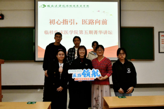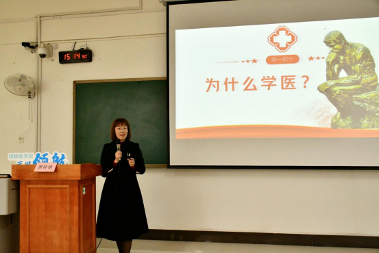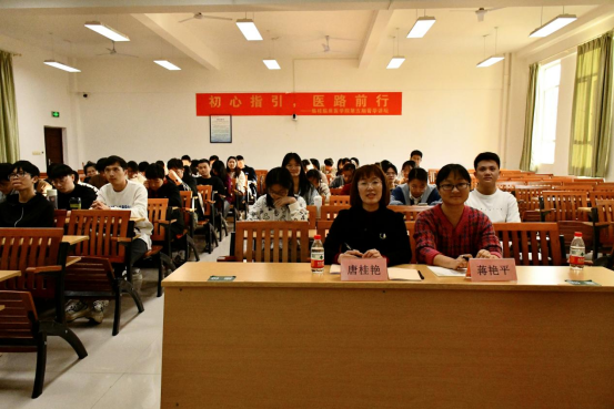 为进一步提高学生的专业素养和道德水平,坚定理想信念,在“弘德善医”的道路上稳步向前,2023年11月28日下午,临桂临床医学院在临桂校区教学北楼N307教室举行“初心指引,医路前行”第五期菁华讲坛活动。本次讲座由桂林医学院第二附属医院盆底医学中心负责人唐桂艳主讲,学工办主任蒋艳平及学生代表约150人参加此次活动。
