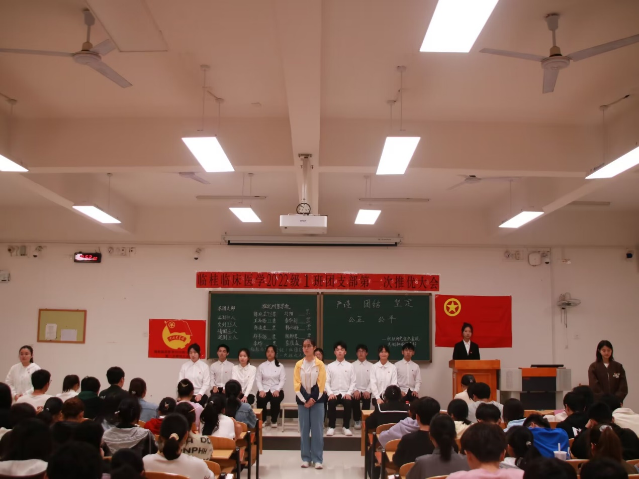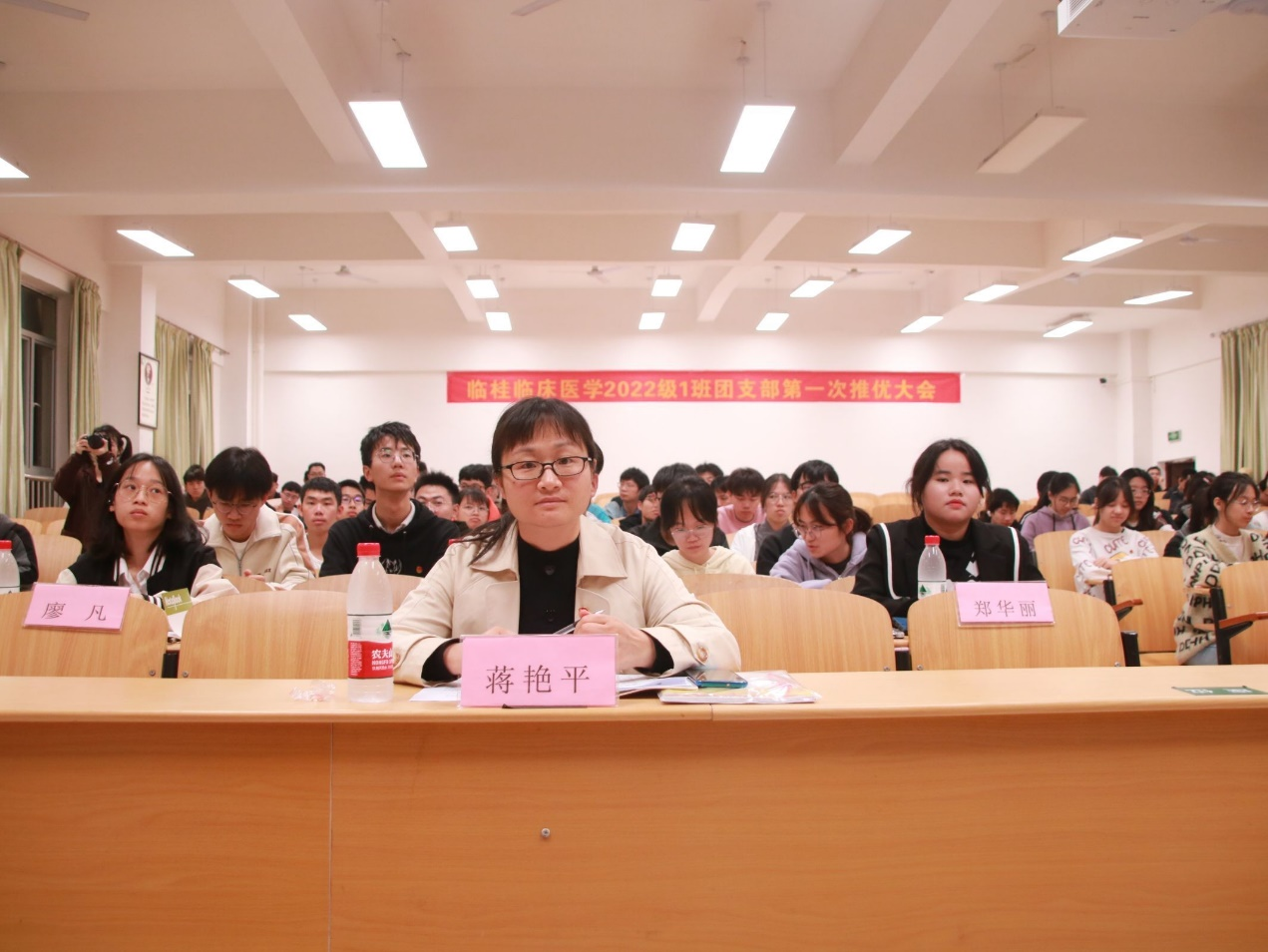 为推荐优秀共青团员加入中国共产党,保持和增强共青团的政治性、先进性,提升团组织建设,2023年4月1日晚上,临桂临床医学2022级1班团支部于临桂校区教学北楼N403举行第一次推优大会。2022级临桂临床医学本科一班辅导员蒋艳平、临桂临床医学院团委、基础医学院团委学生干部代表以及支部全体团员参加此次活动。