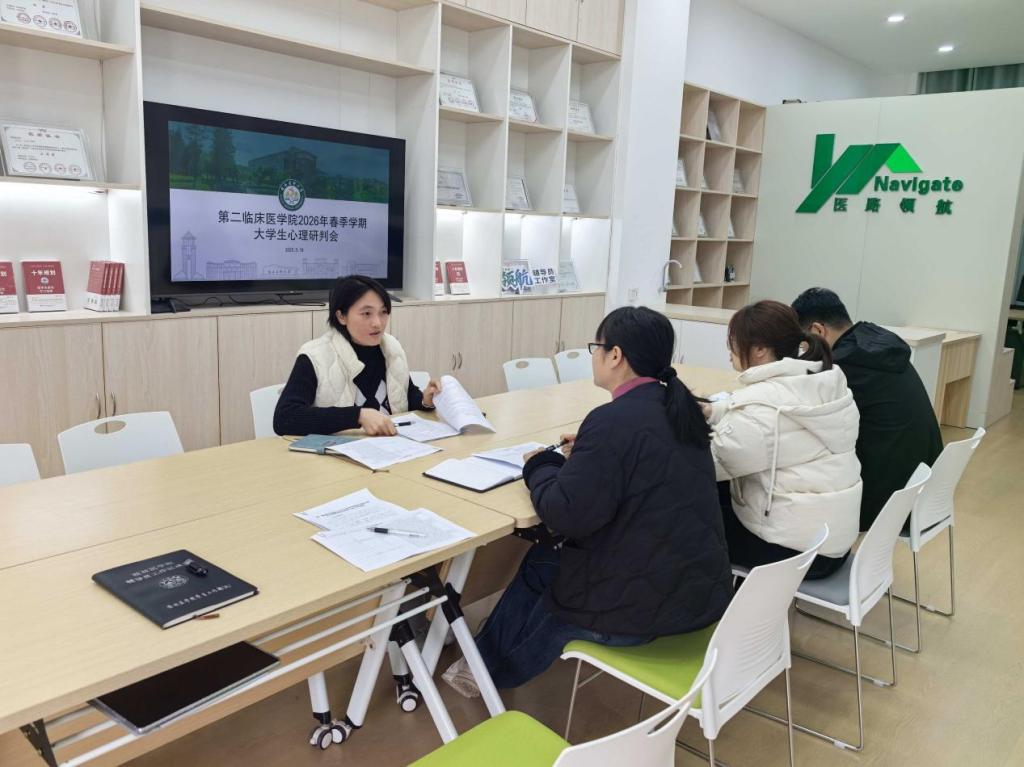 为全面掌握学生心理健康动态,筑牢心理安全防线,提升学生管理工作的精准性与实效性,2026年3月19日上午11:00,第二临床医学院在大学生活动中心辅导员工作室召开2026年春季学期学生心理健康研判会。桂林医科大学学生工作部(处)大学生心理健康教育与咨询中心戴静虞老师以及学工办全体辅导员参加此次会议。