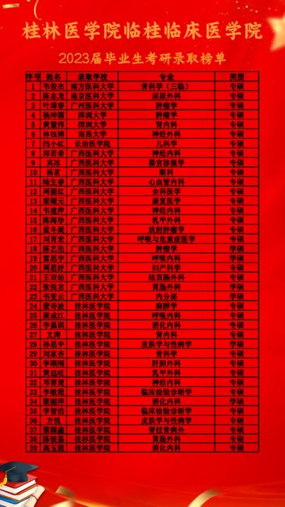 随着2023年全国各高校考研录取工作陆续结束,考研结果也随之揭晓。据统计,18级临桂临床本科班总人数为117人,有39人被录取为硕士研究生,升研率达33.3%。