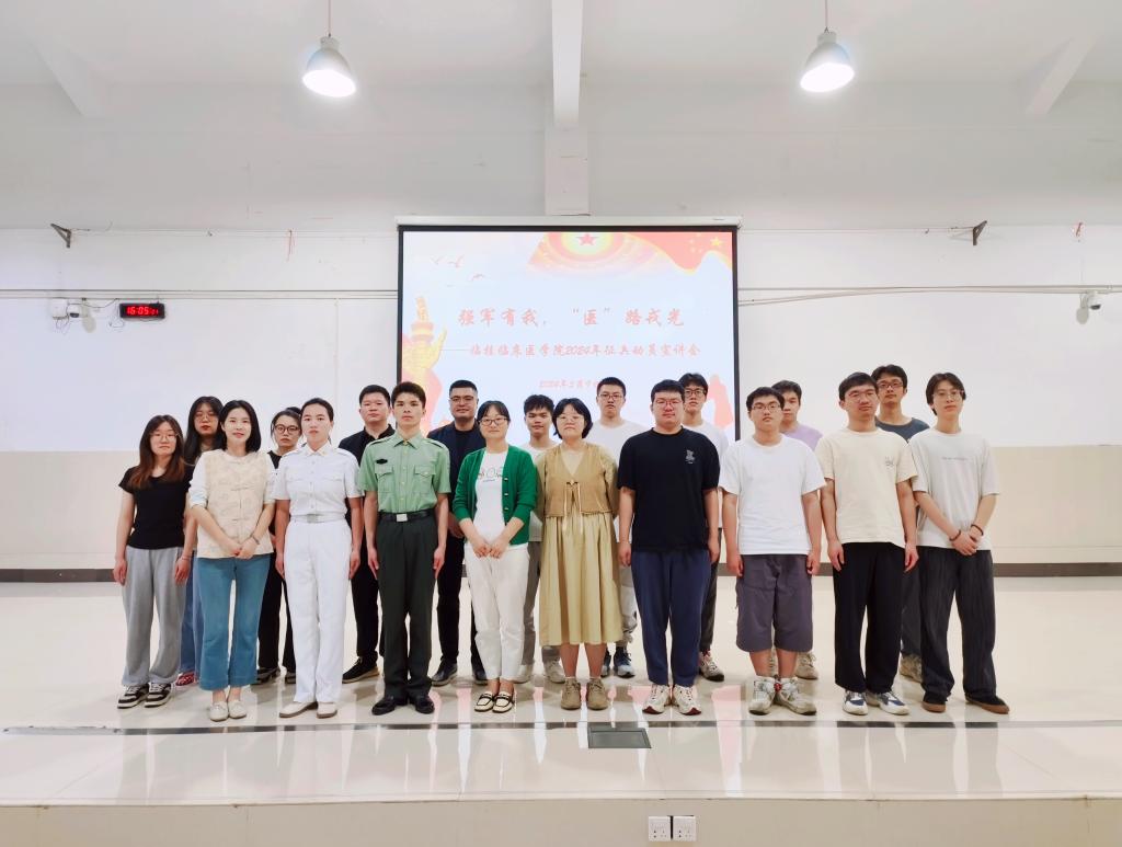 为学习贯彻党的二十大精神,深入贯彻习近平强军思想,深入贯彻新时代军事战略方针,坚持向军为战,为军队征集更多高素质青年,5月9日15:00,临桂临床医学院在临桂校区教学南楼多功能报告厅召开以“强军有我,‘医’路戎光”为主题的征兵工作动员大会。学院党委副书记黄宇平出席会议。学校武装部老师石兴镇,学院学工办全体辅导员,优秀退役复学大学生代表莫炎清、王坤以及学院2025届毕业生参加会议。