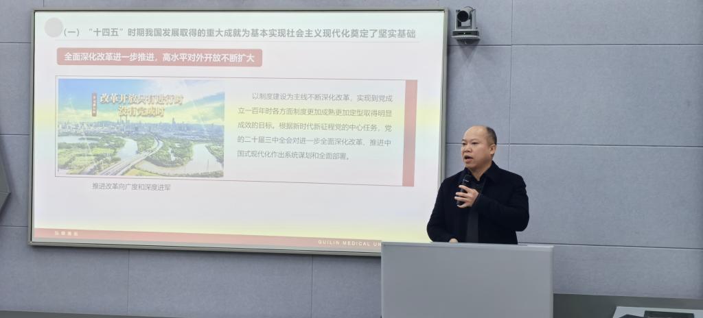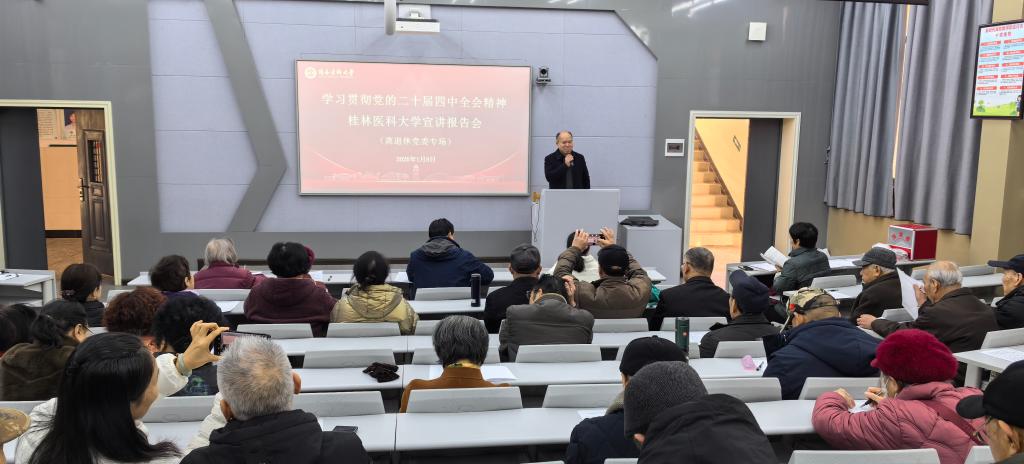 为深入学习贯彻党的二十届四中全会精神,进一步加强离退休职工思想政治建设,1月8日上午,学习贯彻党的二十届四中全会精神桂林医科大学宣讲报告会(离退休党委专场)在乐群校区T1教室举办。校党委常委、副校长覃克强作专题宣讲。离退休职工、党员、离退处全体工作人员现场聆听。报告会由离退休党委书记主持。
