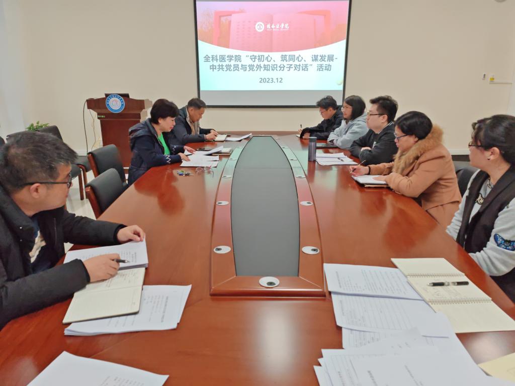 为贯彻落实上级和学校党委关于统战工作的指示精神,进一步加强全科医学院统战工作,充分发挥统一战线优势,推动学院统战工作再上新台阶,2023年12月13日,全科医学院在临床楼211会议室开展以“守初心、筑同心、谋发展”为主题的中共党员与党外知识分子对话活动。对话活动邀请教学与科研科临时负责人李晖莉参加,学院党政领导、专职组织员、支部书记参加此次对话活动,活动由党委副书记、纪委书记潘涛主持。