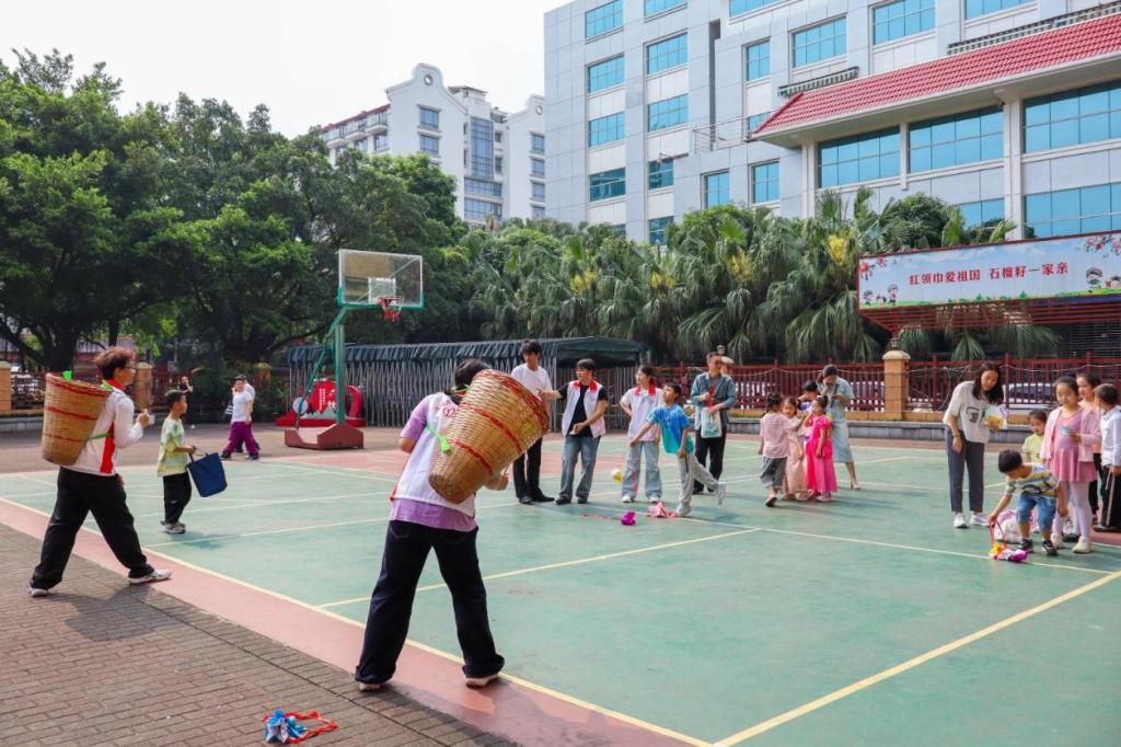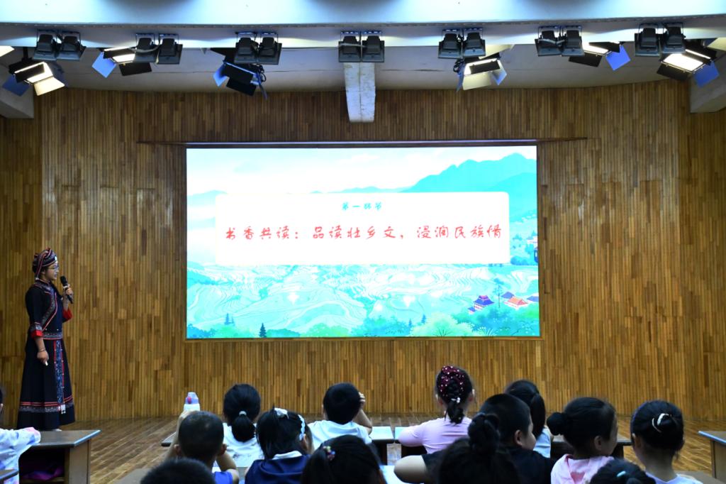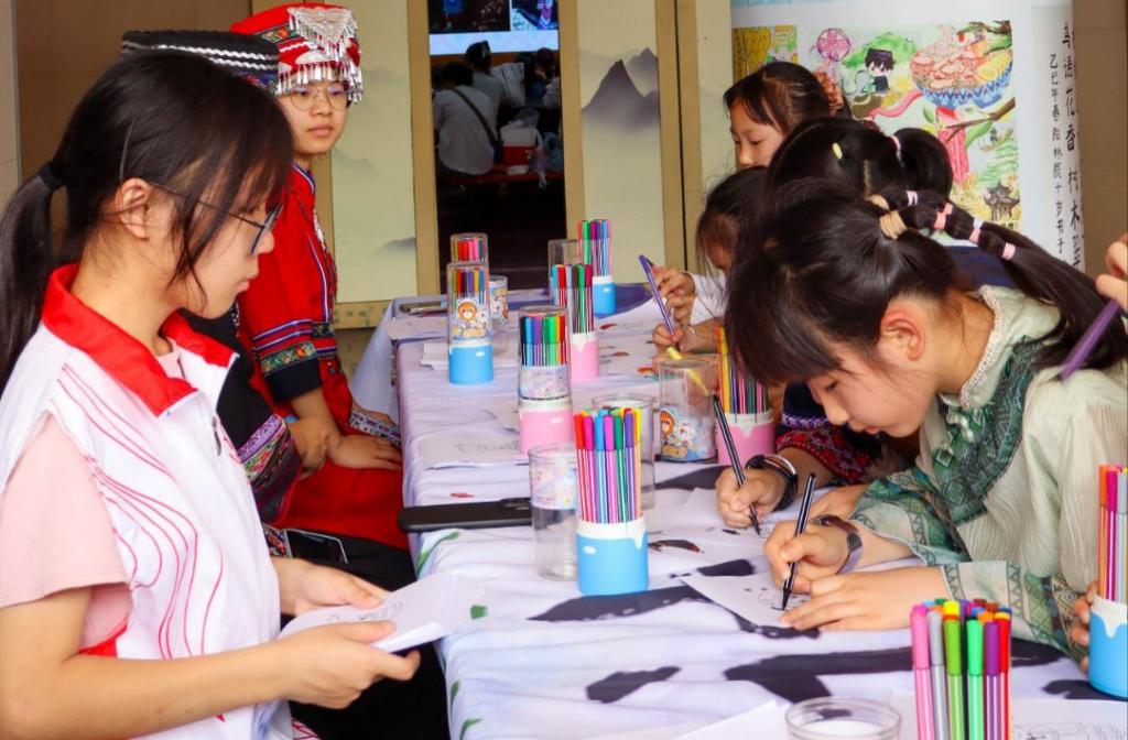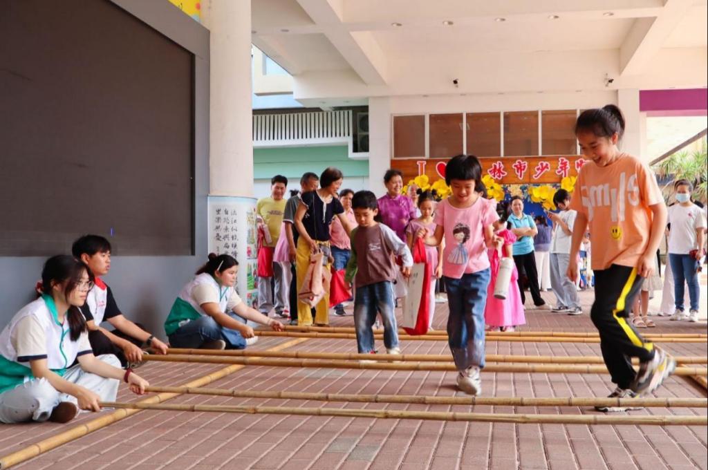在文化苑,学生志愿者带来少数民族舞蹈《广西尼的呀》,灵动的舞姿瞬间点燃全场气氛。随后,志愿者组织阅读分享会,带领孩子们诵读壮乡诗词《三月歌飞,情满壮乡》,并通过分享绘本故事与民间传说,引导孩子们走进壮乡文化深处,感受书香之中的民族情谊。在小太阳广场,丰富多彩的互动活动让孩子们应接不暇。在欢乐竹竿舞体验区,孩子们在志愿者的示范下跳起竹竿舞,灵活穿梭、跳跃腾挪,在欢声笑语中感受壮乡传统舞蹈的活力。在背篓绣球趣味挑战区,孩子们与志愿者一同投掷绣球,在趣味互动中体验民俗游戏的快乐。在巧手制作绣球区,志愿者带领孩子们制作手工绣球,一个个承载着吉祥寓意的作品充满童趣与心意。在民族服饰填色区,孩子们拿起画笔,为壮族传统服饰的精美纹样上色,用色彩勾勒出壮乡服饰的独特美感。