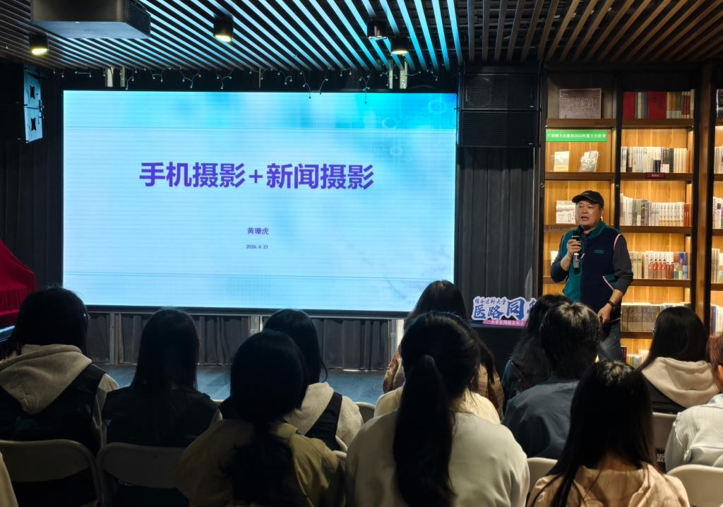 在参观环节,同学们走进广西师范大学出版社新媒体电商部直播室,与直播团队老师深入交流,详细了解直播流程、设备配置、选品策略及后台运营等内容。同学们听得格外认真,不时提出自己的疑问,直播团队老师都耐心解答。随后,师生一行移步至独秀书房旗舰店,参观“三月三”少数民族服饰展。精美的民族服饰与书香环境相得益彰,同学们纷纷用手机拍摄记录,积累摄影素材。本次活动特邀国家高级摄影师、视觉中国签约摄影师、桂林市职工摄影协会副主席、广西师范大学摄影学会主席黄珊虎给师生作“手机摄影+新闻拍摄”主题培训。他结合自己实际拍摄的案例,给大家讲解手机摄影和新闻拍摄的技巧。例如,怎样取景能让照片更吸引人,如何抓拍能抓住精彩瞬间,以及新闻拍摄要注意哪些要点等,现场气氛热烈。同学们纷纷提出,本次培训学到了很多实用的技巧,以后拍照更有信心了。
