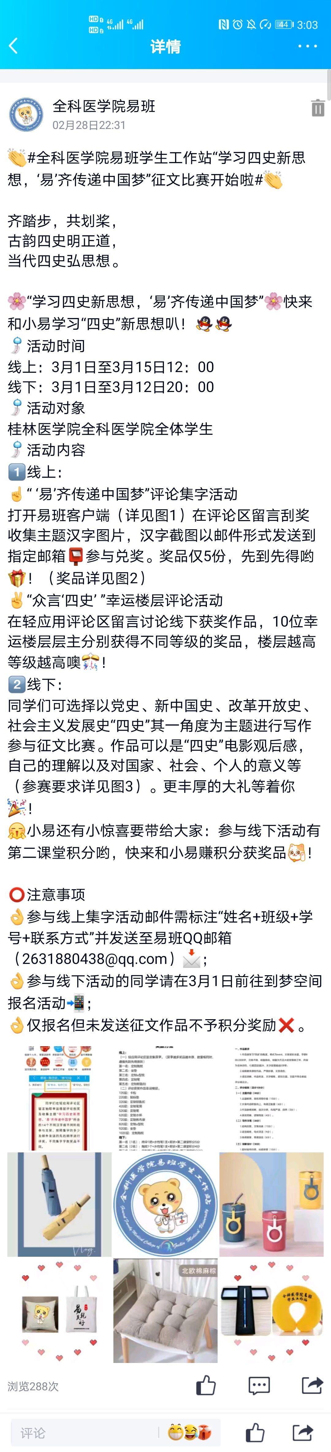 为了弘扬社会主义核心价值观,让更多的同学了解“四史”新思想,同时营造书香校园氛围,结合党史学习教育工作部署,全科医学院于2021年3月举办“学习四史新思想,‘易’齐传递中国梦”为主题的征文比赛,此次活动由全科医学院易班学生工作站承办,学院共有100多名学生参与征文活动。