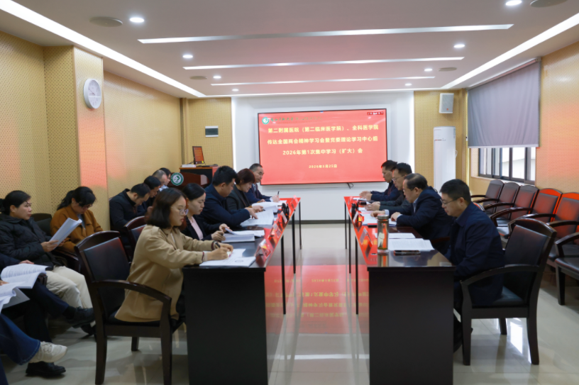 3月25日,第二附属医院(第二临床医学院)、全科医学院召开传达全国两会精神学习会暨党委理论学习中心组2026年第1次集中学习(扩大)会。全体院领导、中心组成员参加会议,会议由党委书记葛波主持。
