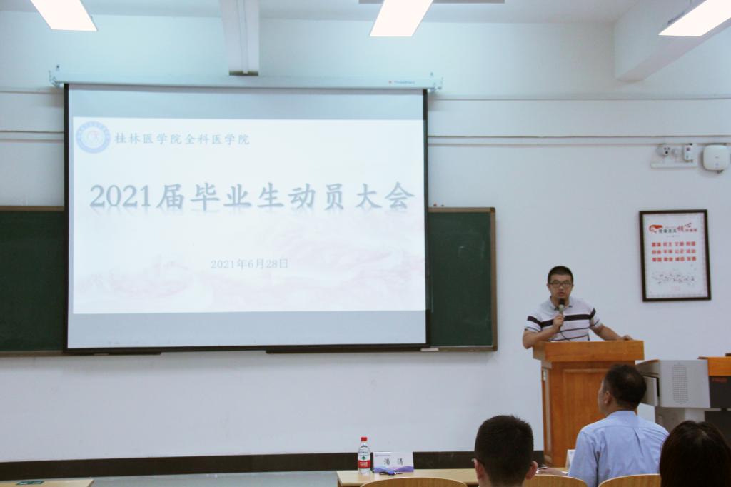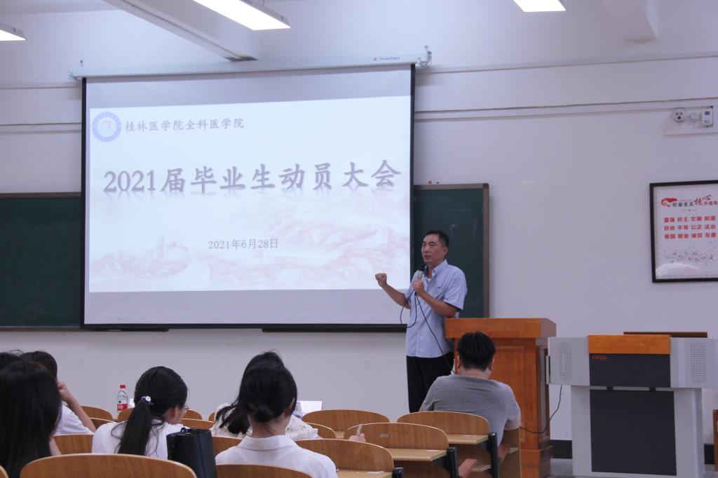 6月28日下午,全科医学院在桂林医学院临桂校区N104教室举办“2021届毕业生”动员大会。学院院长蒋晓山、学院党委副书记潘涛、16全科辅导员陈辰及16全科班全体同学参加了本次会议。