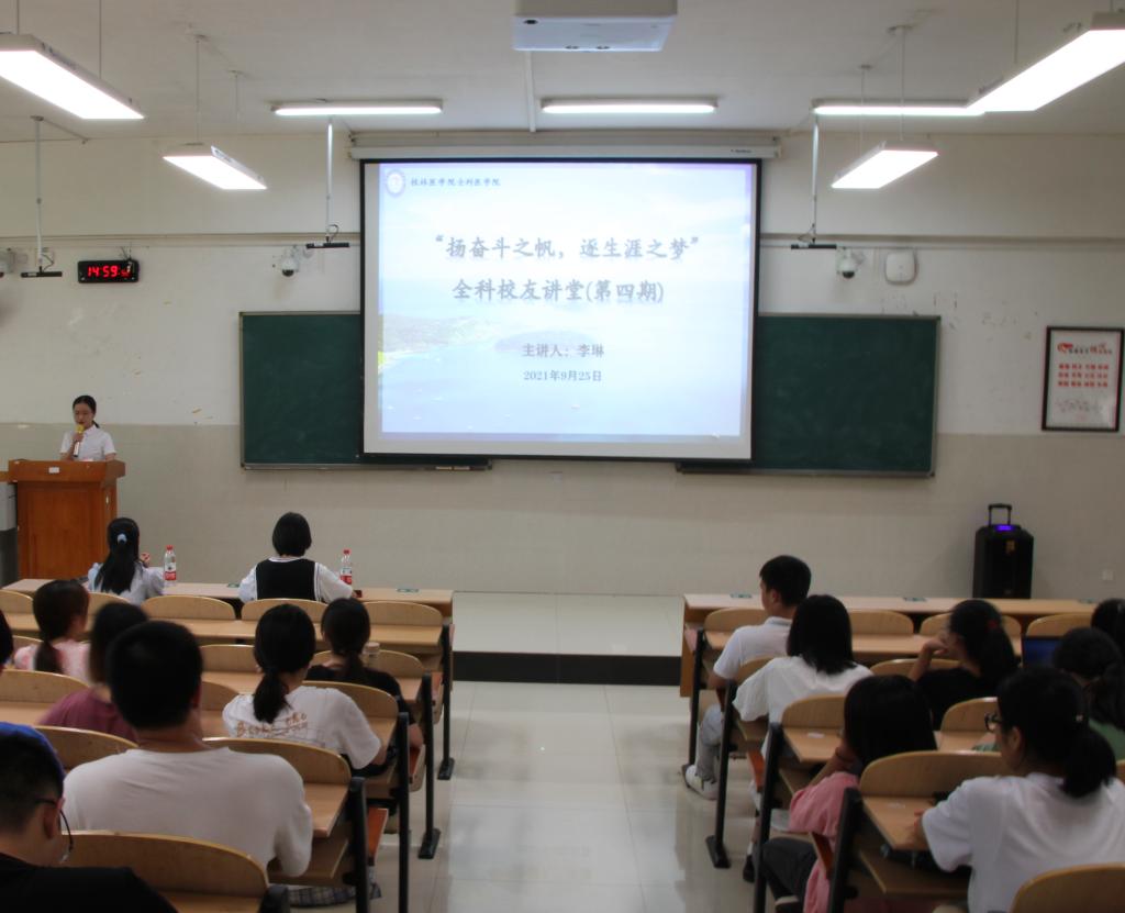 为解决学生在日常的学习和生活等方面所存在的疑惑,拉近优秀校友与母校的距离,让优秀校友再次感受母校的氛围,引导学生往更加优秀的道路上前进。2021年9月25日,全科医学院举办“扬奋斗之帆,逐生涯之梦”第四期校友讲堂。全科医学院学工办辅导员何金宝、张健铭及2020级全体学生参加此次活动。主讲人为2015级全科医学本科班毕业校友李琳。