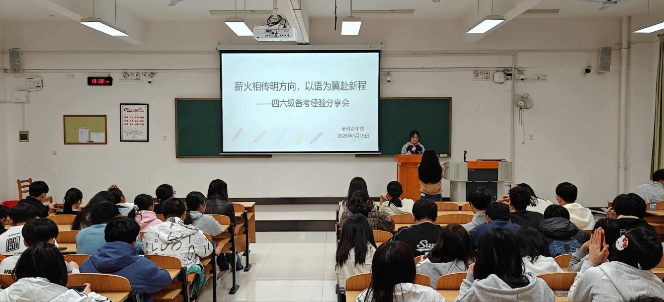 为引导新生尽快适应大学学习节奏,明确学习目标,掌握科学高效的英语四、六级备考方法,合理规划学习时间并调适备考心态,3月15日晚,全科医学院在临桂校区教学南楼S304教室举办学习经验分享会。2023级学生代表曾芸、罗蓉担任主讲嘉宾,2025级全体同学到场参加。