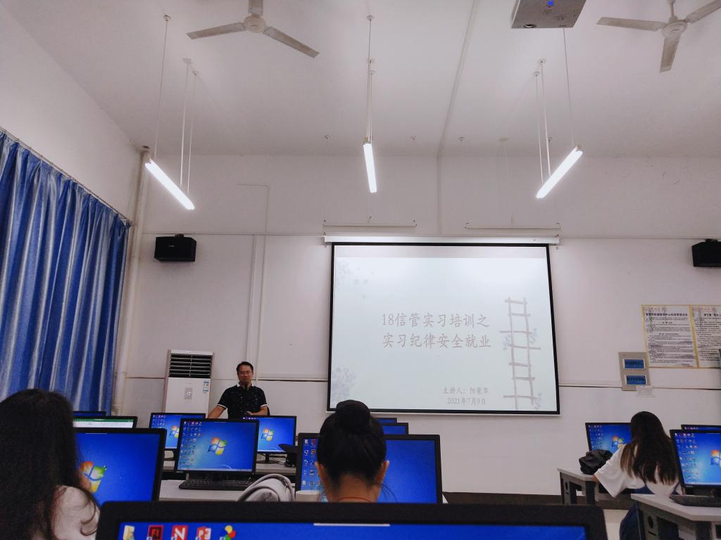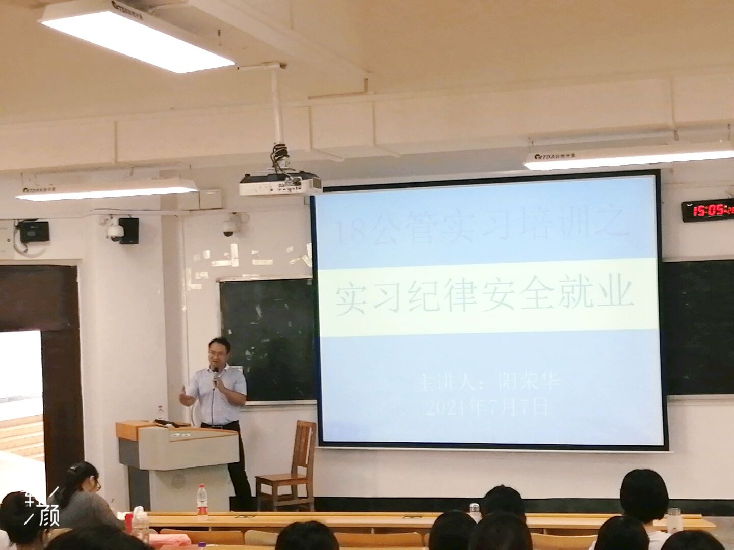 为做好学生实习工作,人文与管理学院面向实习班级进行了系列培训。7月7日下午,7月9日上午,18公管和18信管分别在东城校区T1-1和临桂校区基础楼2107举行实习培训之实习纪律安全和就业动员,人文与管理学院党委副书记阳荣华主讲。班级辅导员李旭梅以及班级全体同学参会。