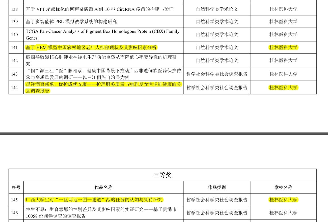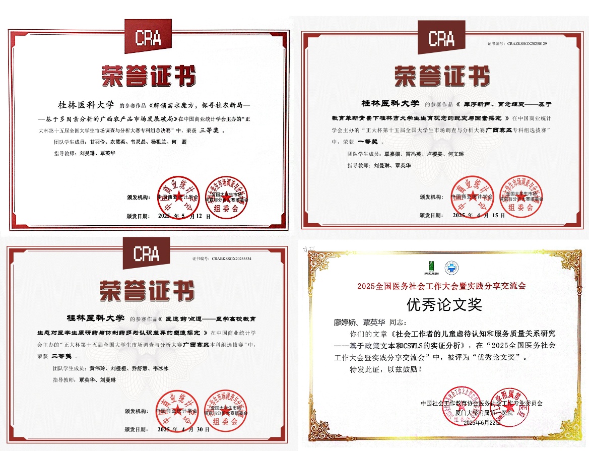 此外,人文与管理学院学子近期在各类学科竞赛中屡创佳绩:在第十五届全国大学生市场调查与分析大赛中,斩获国赛三等奖1项及多项区赛一、二等奖;在2025年全国医务社会工作大会暨实践分享交流会征文比赛中荣获优秀论文奖;在第十二届“挑战杯”广西大学生课外学术科技作品竞赛中获得全区二等奖1项、三等奖3项。这一系列荣誉的取得,展现了我校人文学子深厚的专业素养、突出的创新实践能力和良好的精神风貌。