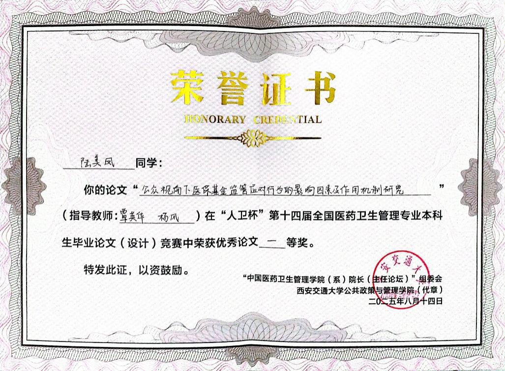 该赛事作为我国医药卫生管理类专业本科生培养领域的标杆性全国性赛事,吸引了全国78所高校的206篇高水平毕业论文投稿,最终仅评选出10篇一等奖作品,我校学子的获奖充分彰显了其扎实的专业功底与出色的研究能力。
