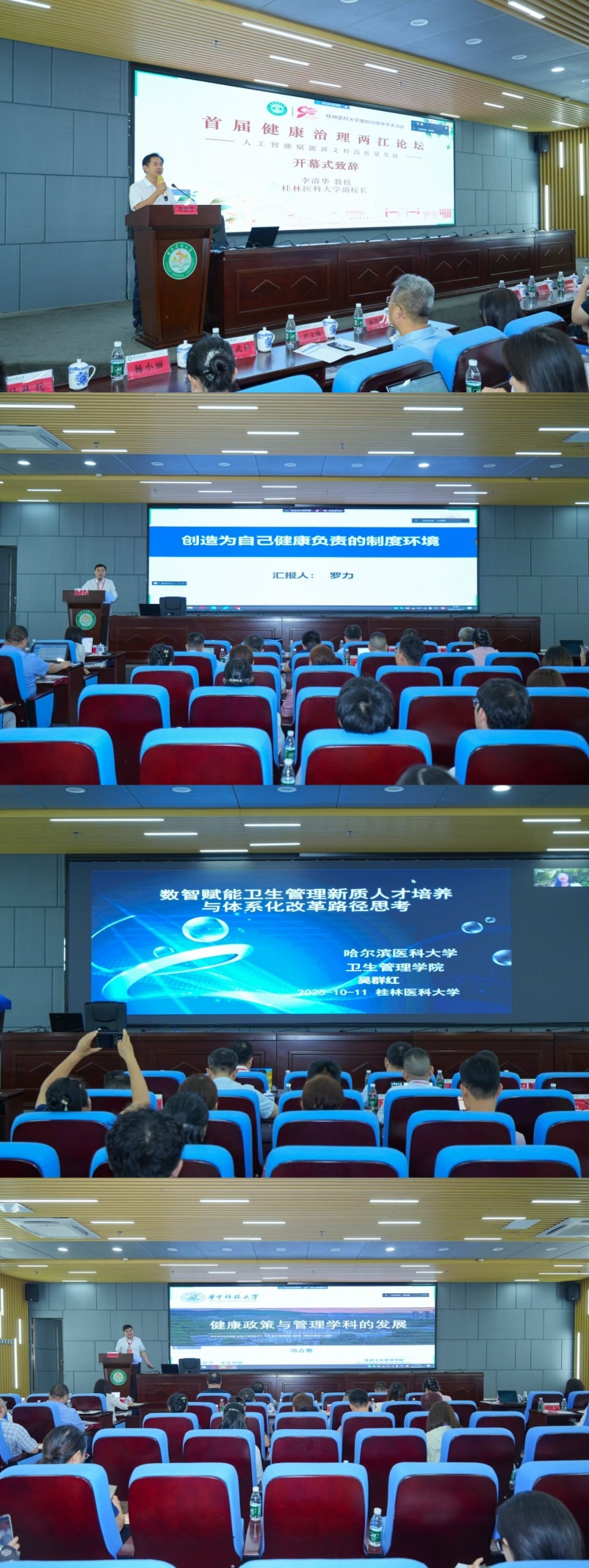 九秩风华,学术报国。2025年10月11日,我校人文与管理学院承办的首届“健康治理两江论坛”在临桂校区科学实验中心报告厅隆重举行。论坛以“人工智能赋能新文科高质量发展”为主题,汇聚来自复旦大学、哈尔滨医科大学、华中科技大学、西安交通大学等十余所高校的知名学者及多位国家级高层次人才。近200名师生参与活动,现场座无虚席。